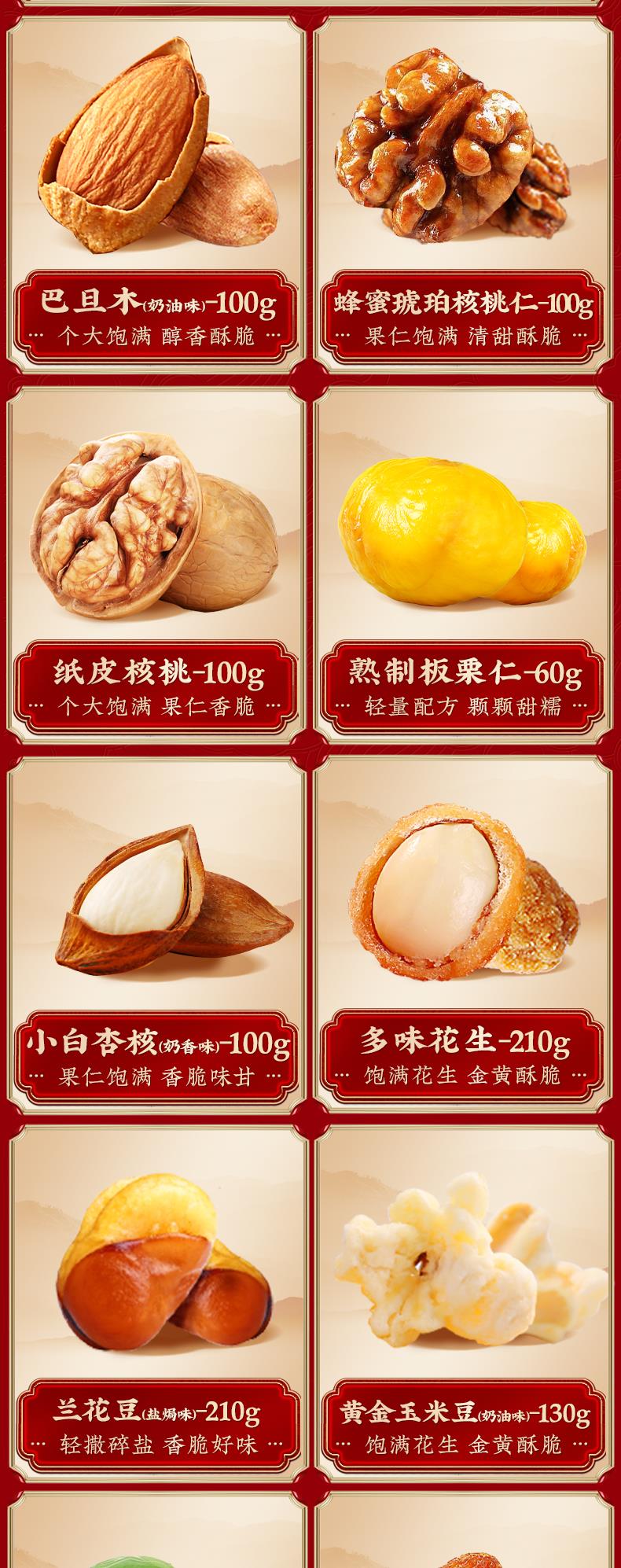 【百草味】开心果 80g/【百草味】夏威夷果(奶油味) 100g/【百草味】巴旦木(奶油味)100g/【百草味】小白杏核(奶香味)100g/【百草味】纸皮核桃 100g/【百草味】蜂蜜琥珀核桃仁 100g/【百草味】熟制板栗仁 60g/【百草味】香酥小豌豆(蒜香味) 210g/【百草味】多味花生 210g/【百草味】兰花豆(盐焗味)210g/【百草味】玫瑰红葡萄干 58g/【百草味】黄金玉米豆(奶油味)130g/【百草味】每日坚果乳 250g/【百草味】红枣银耳羹312g