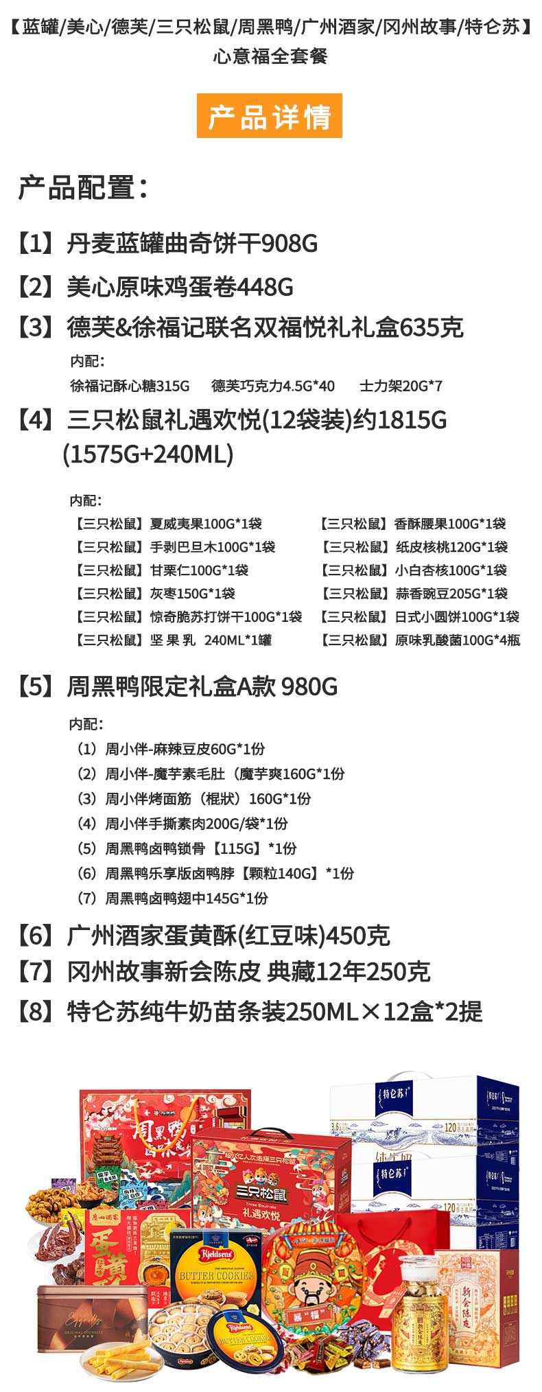 蓝罐/美心/德芙/三只松鼠/周黑鸭/广州酒家/冈州故事/特仑苏-牛奶休食心意福全组合