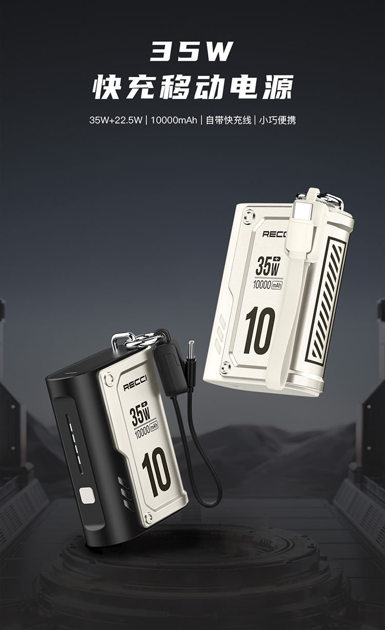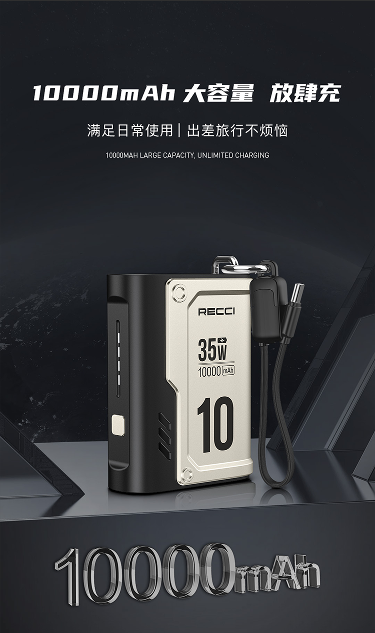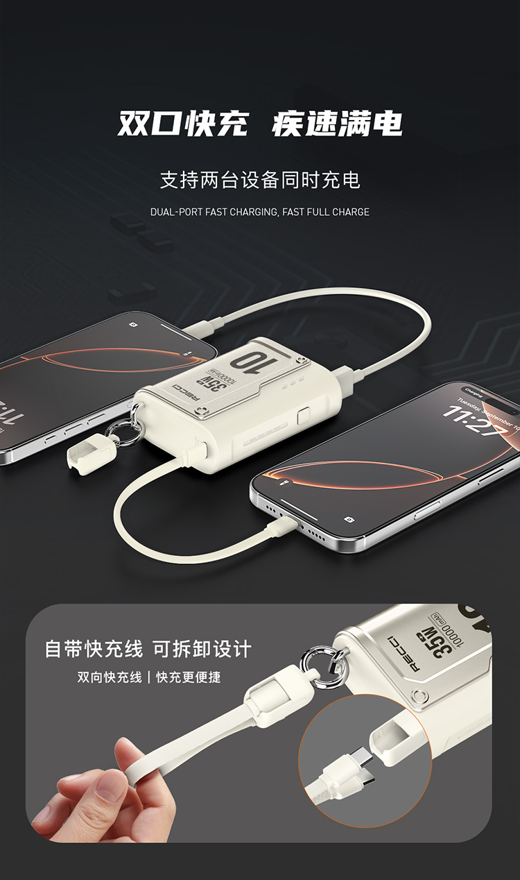 RECCI锐思RPB-P57移动电源一万毫安PD快充35W多接口Type-C口充电宝自带线支持苹果15/16兼容安卓华为 10000mAh