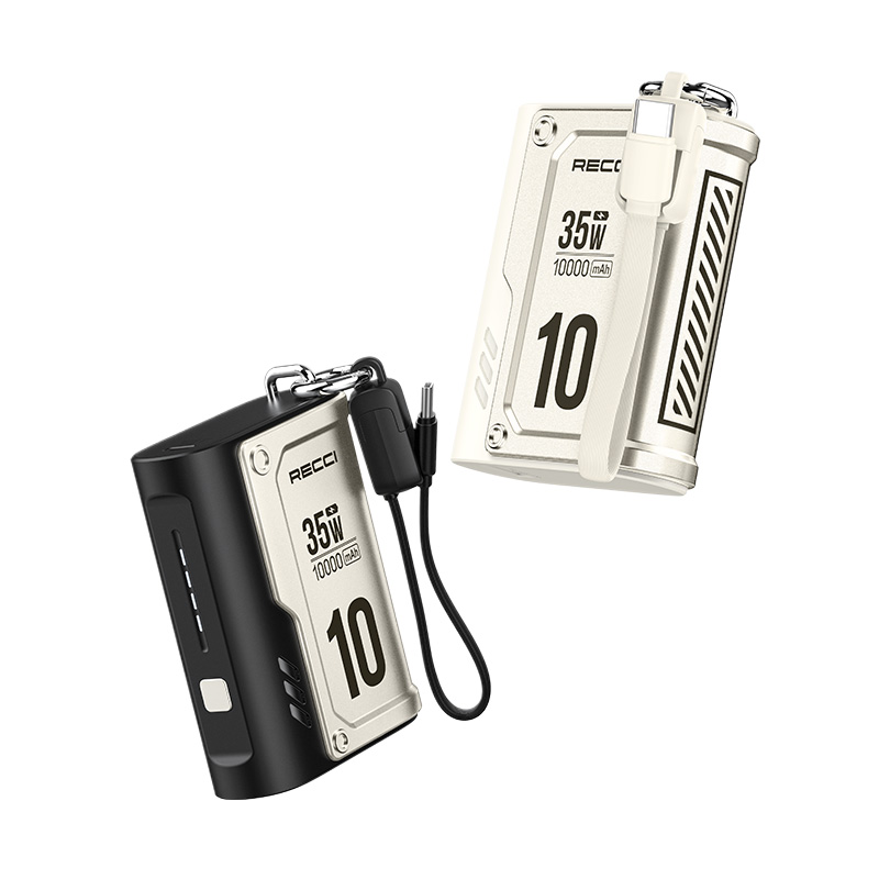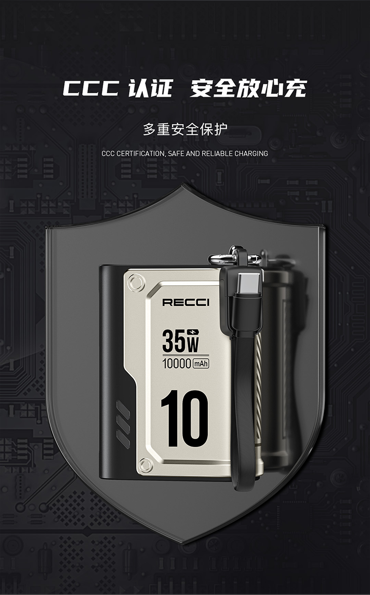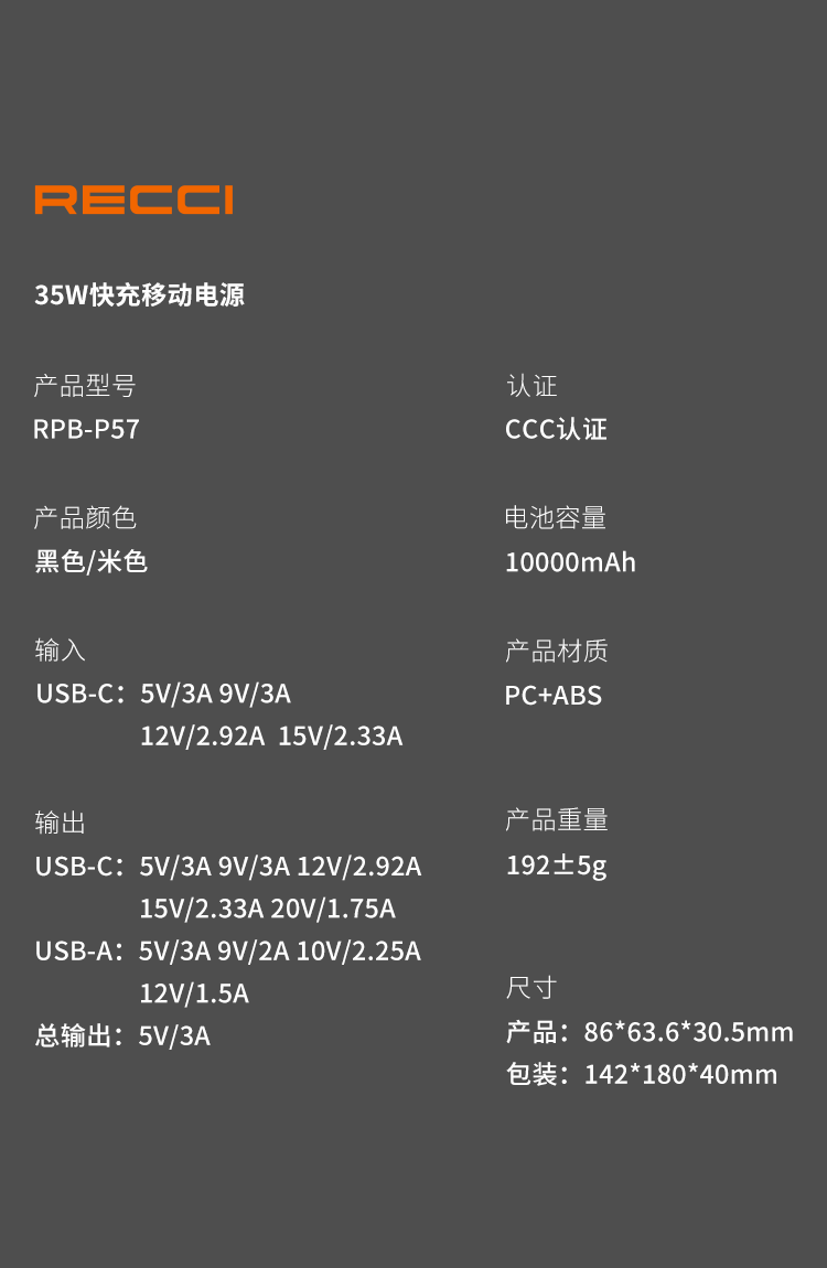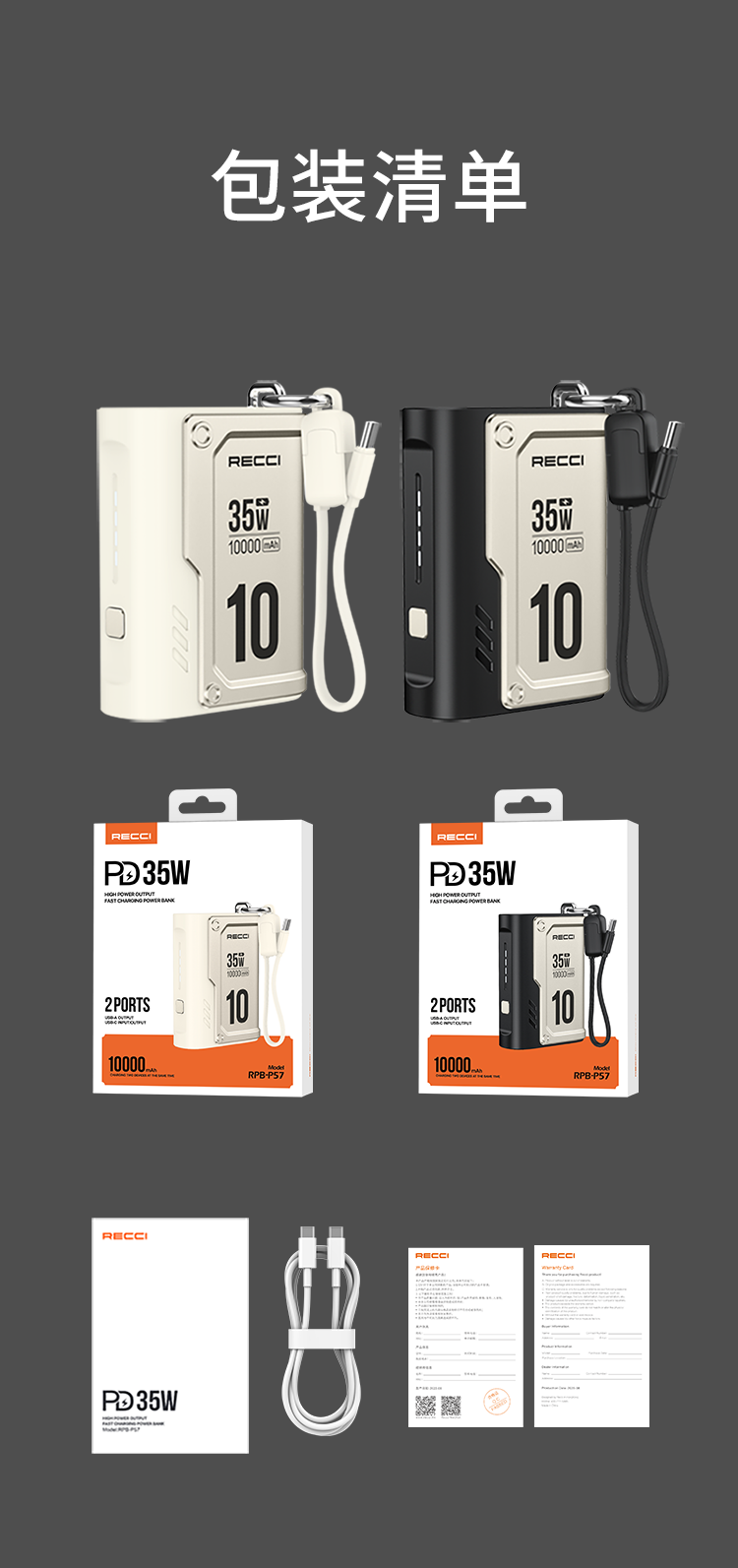 RECCI锐思RPB-P57移动电源一万毫安PD快充35W多接口Type-C口充电宝自带线支持苹果15/16兼容安卓华为 10000mAh