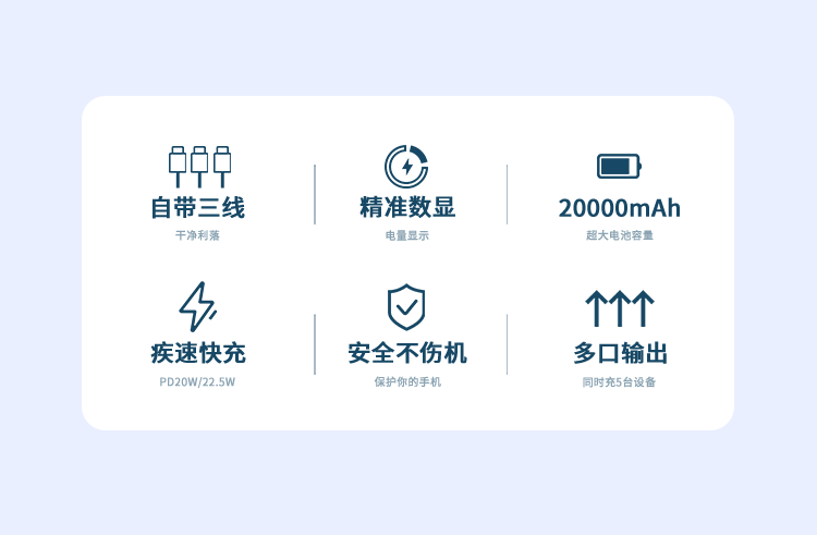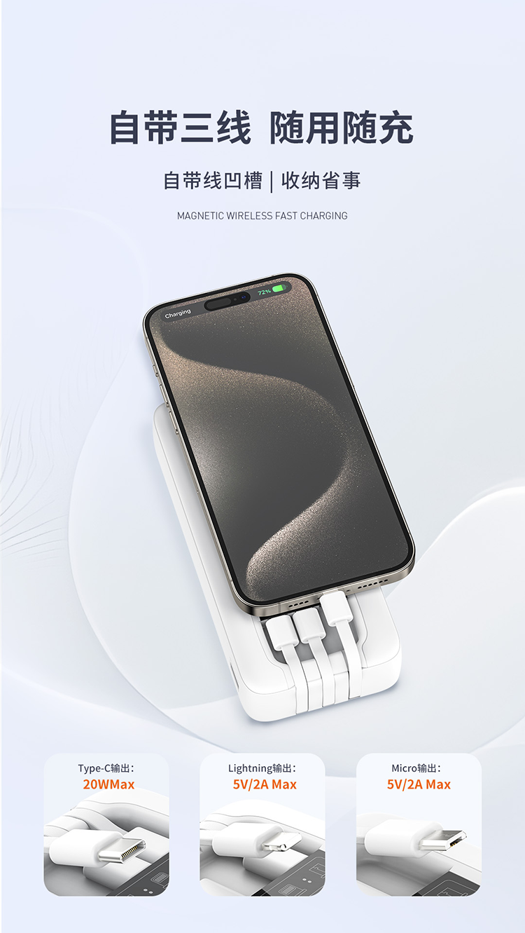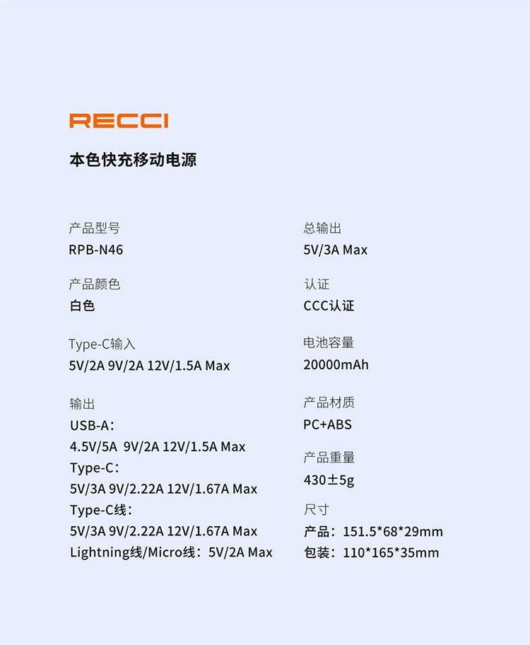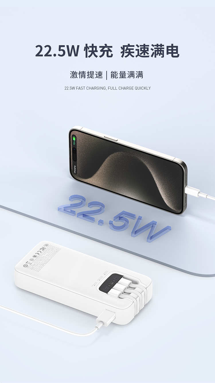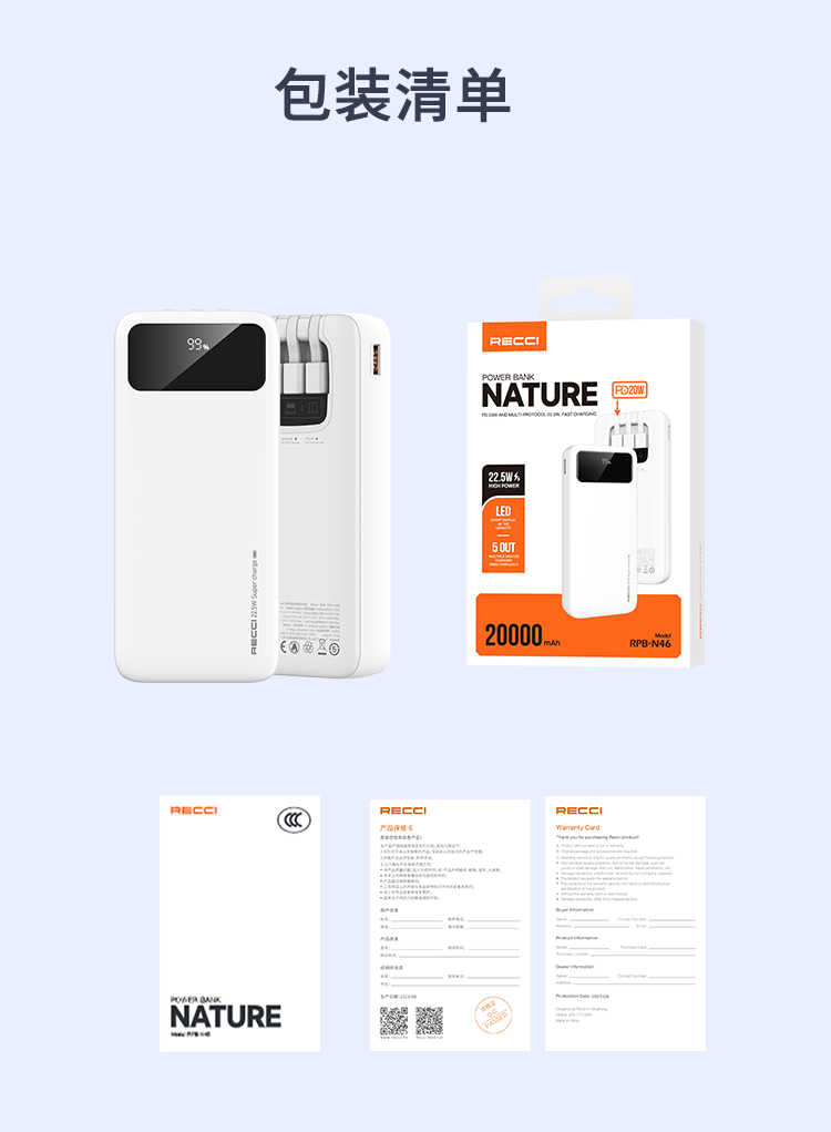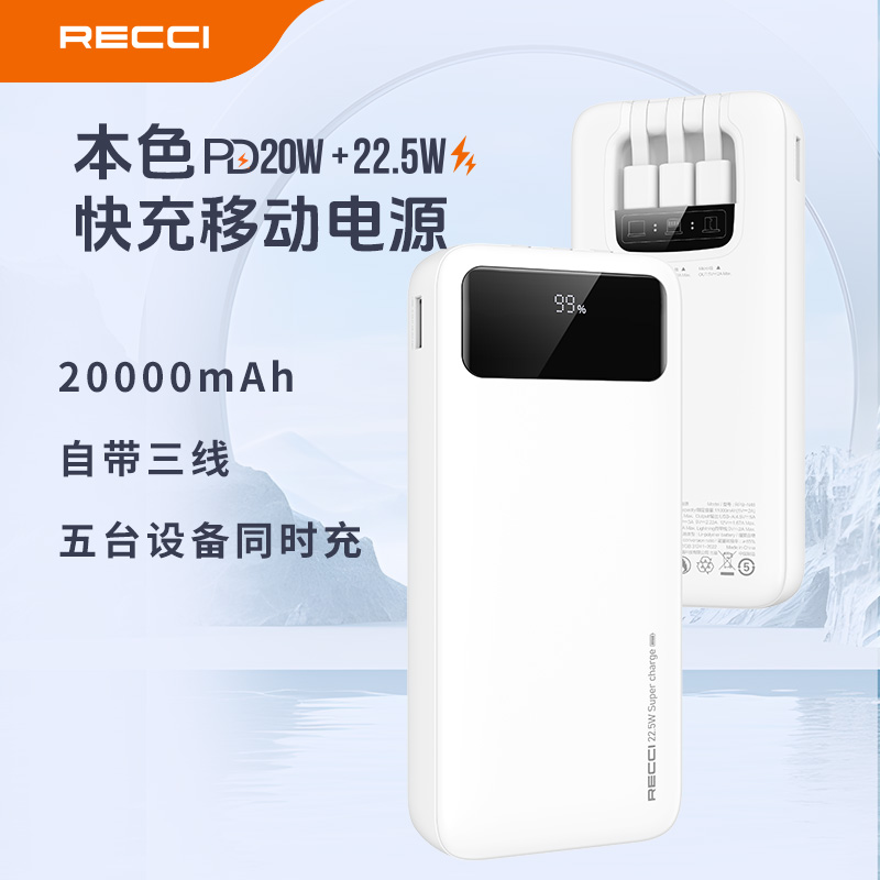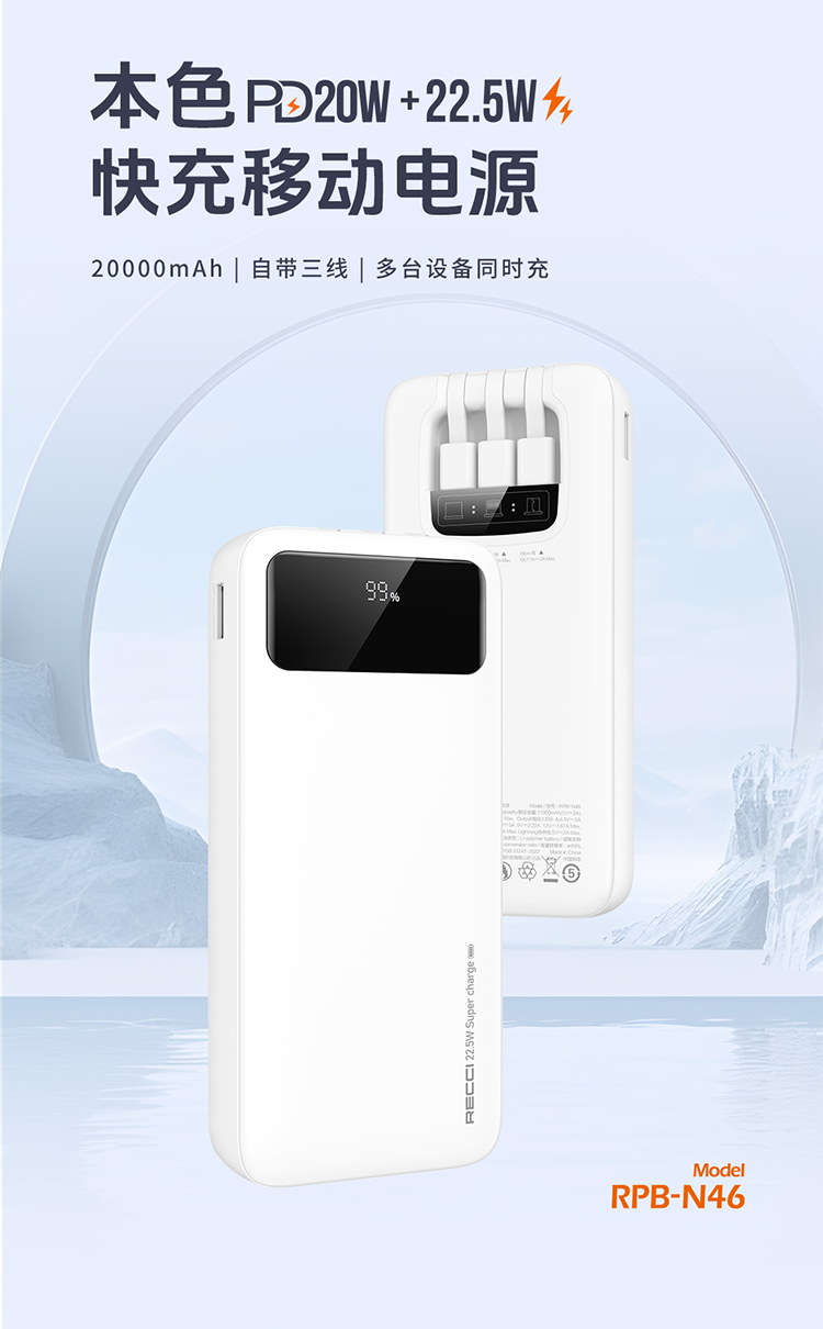 RECCI锐思RPB-N46充电宝22.5W+PD20W自带线20000mAh可支持苹果 20000毫安