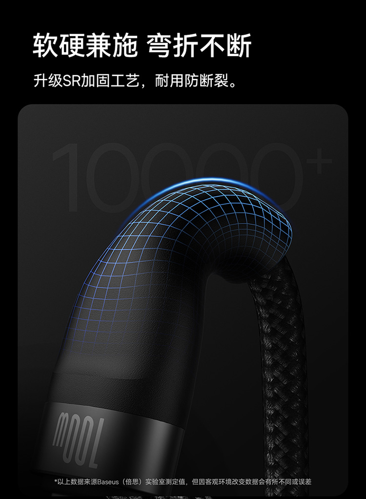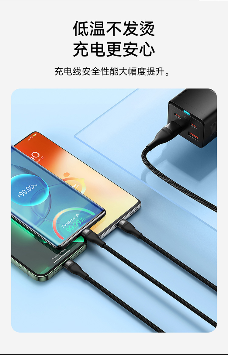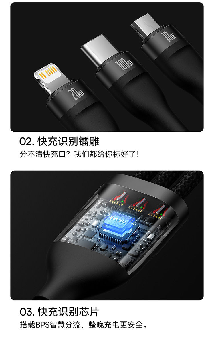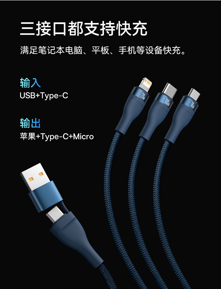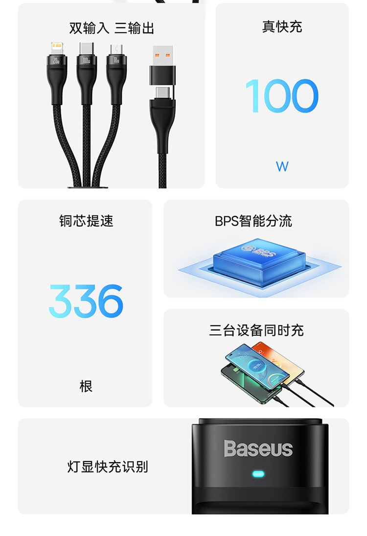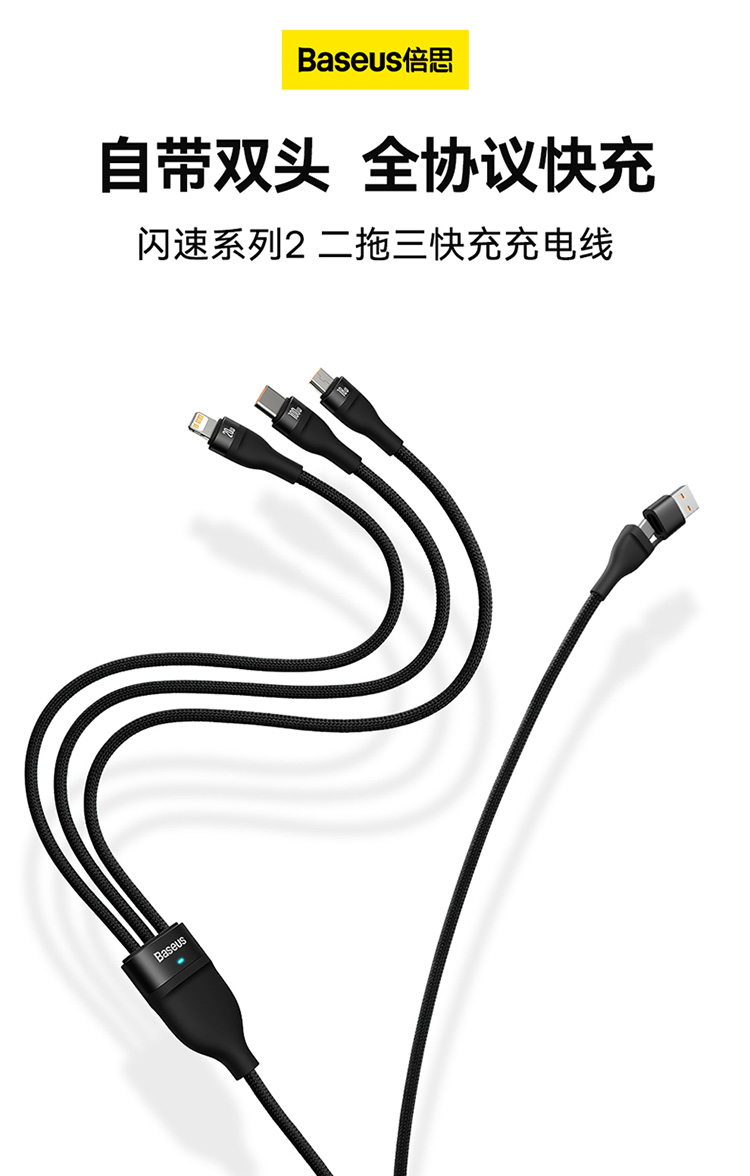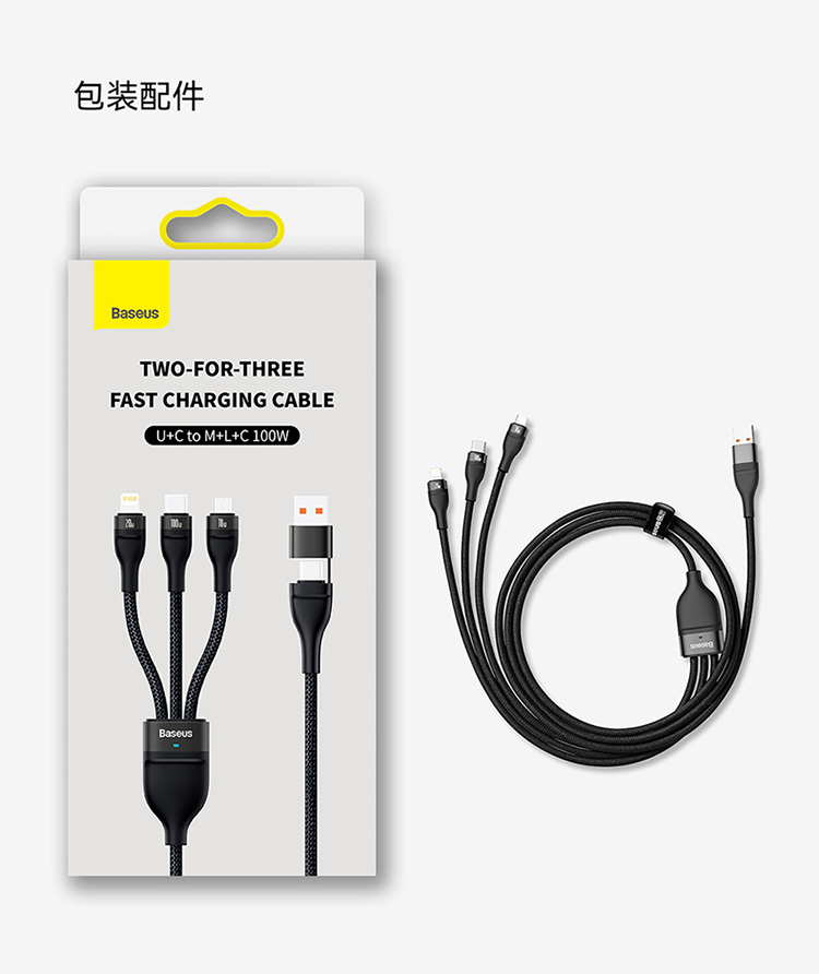 倍思闪速系列2二拖三快充充电线U+CtoM+L+C100W规格:1.2m黑色