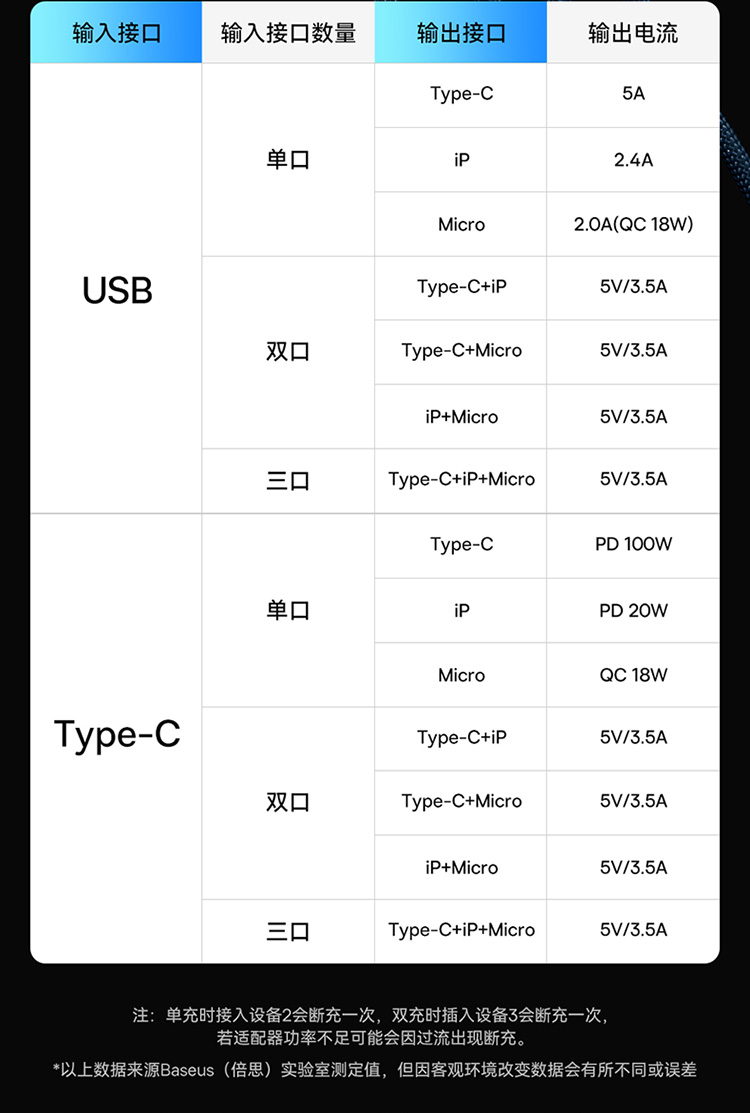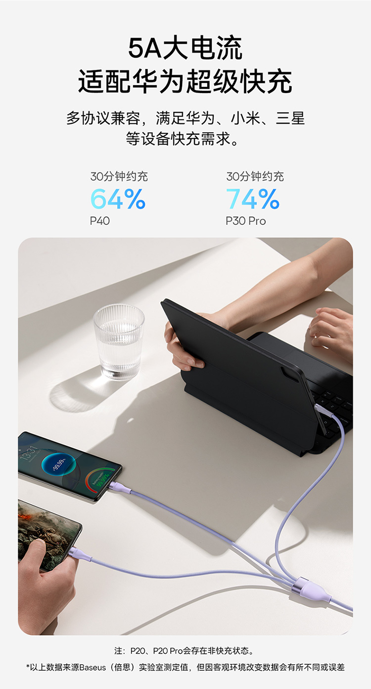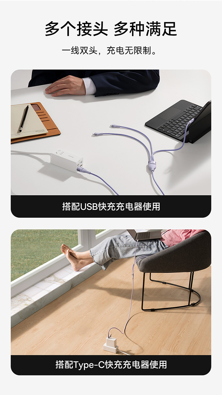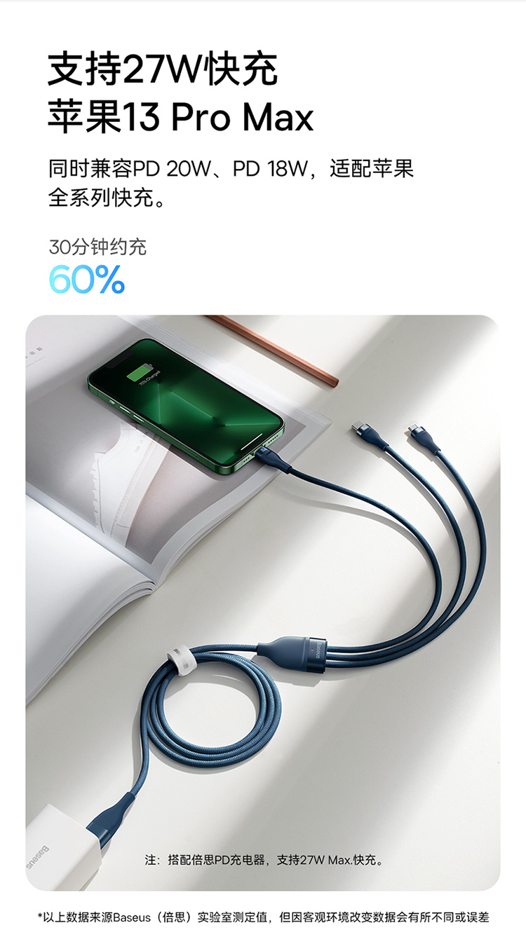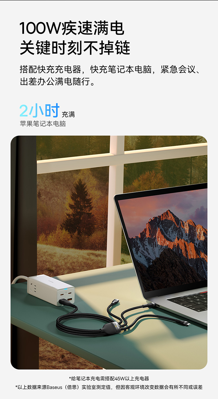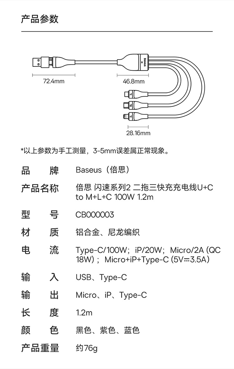 倍思闪速系列2二拖三快充充电线U+CtoM+L+C100W规格:1.2m黑色