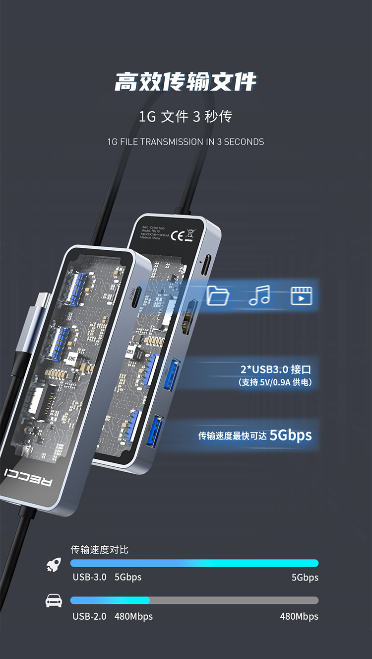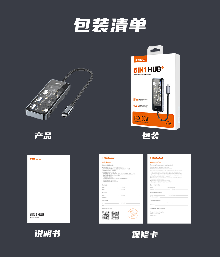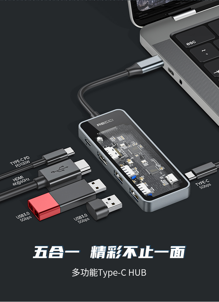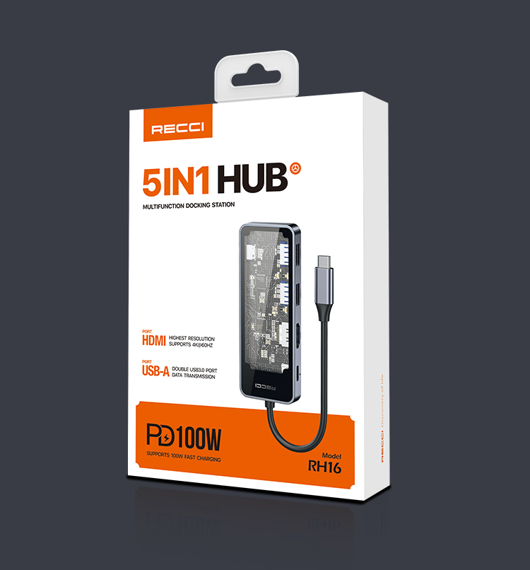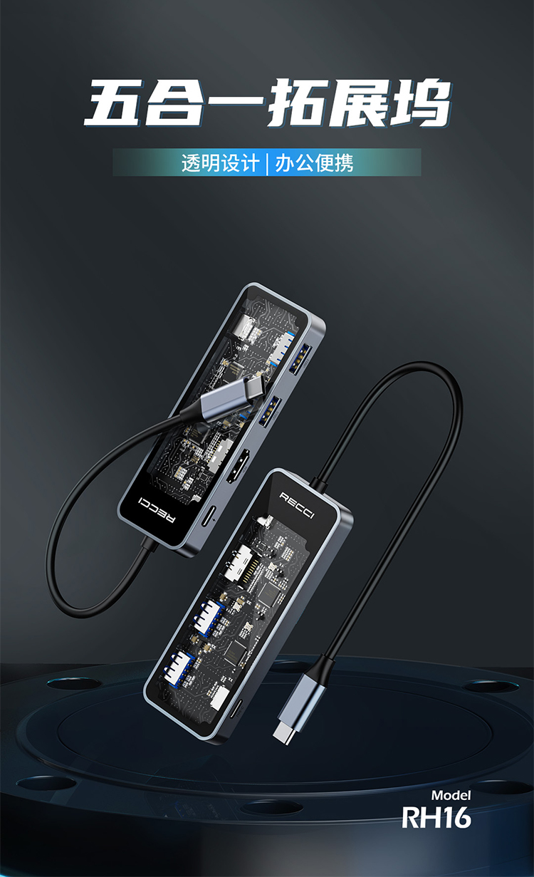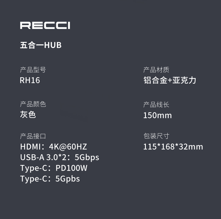 RECCI锐思RH16数据线支持PD100W充电线转HDM五合一HUB