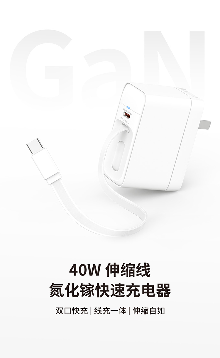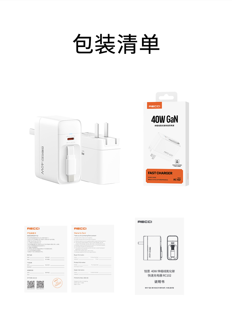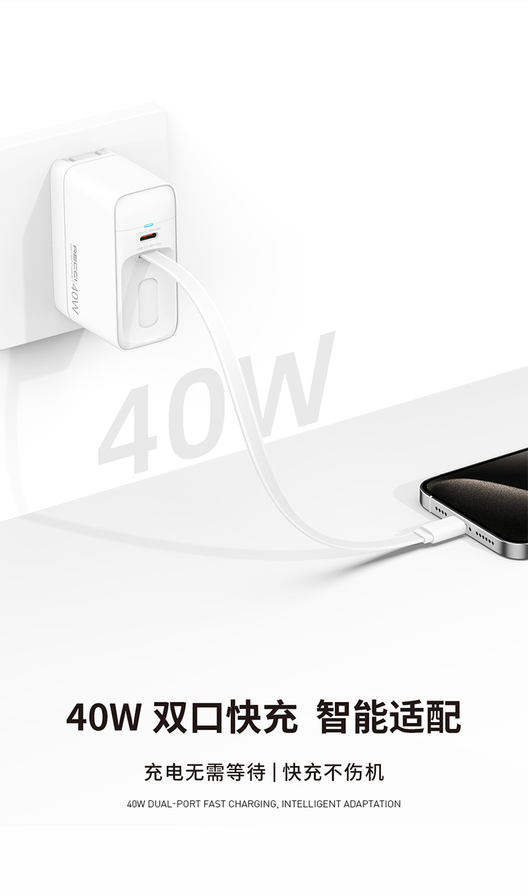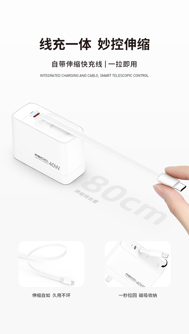RECCI锐思40W伸缩线氮化镓快速充电器RC102 白色