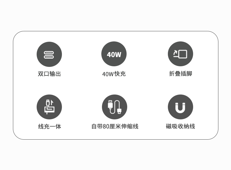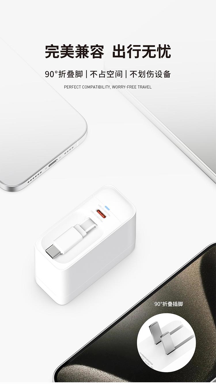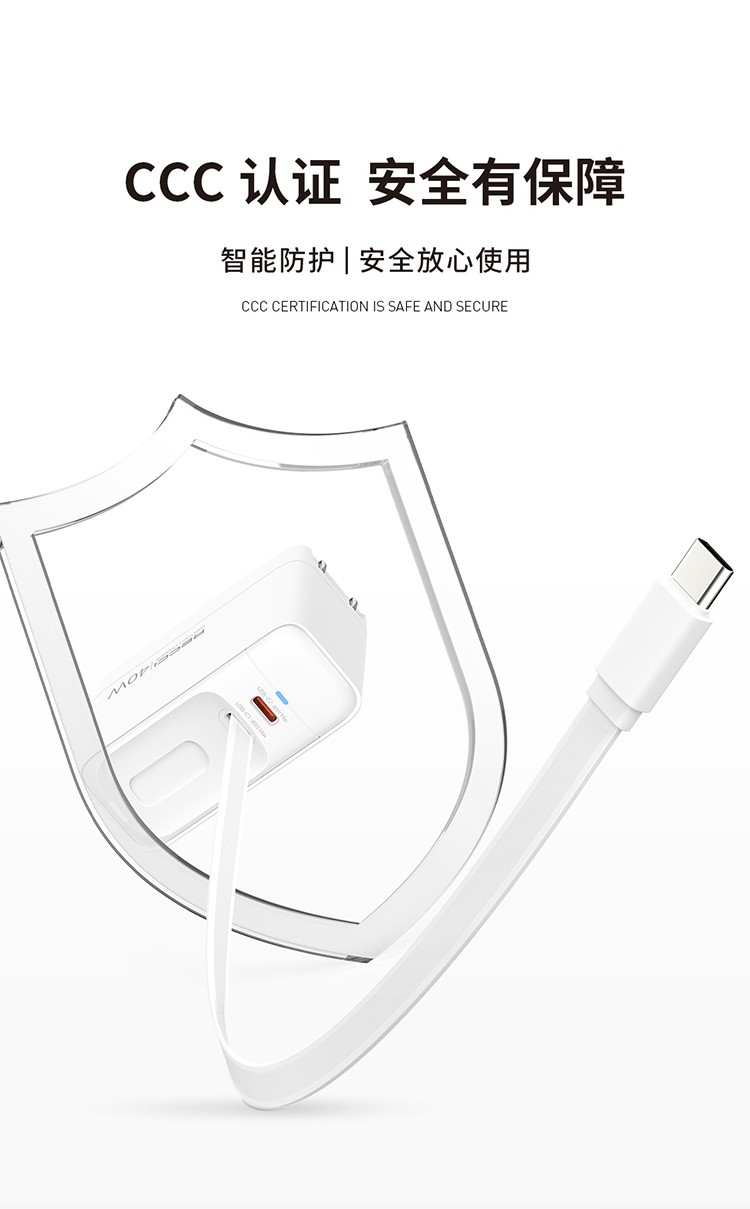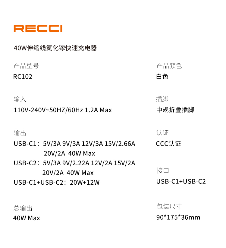 RECCI锐思40W伸缩线氮化镓快速充电器RC102 白色