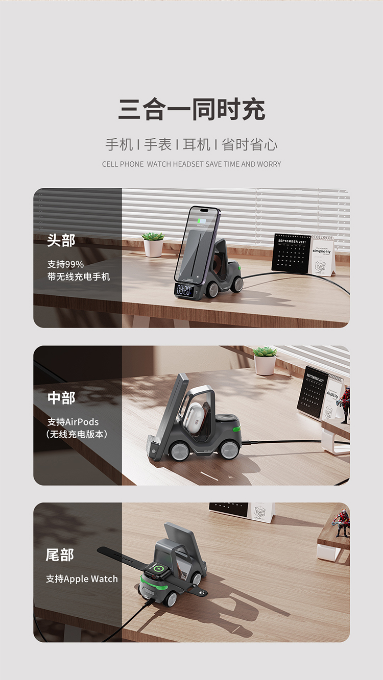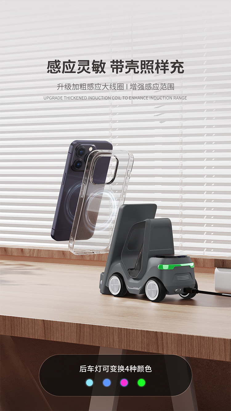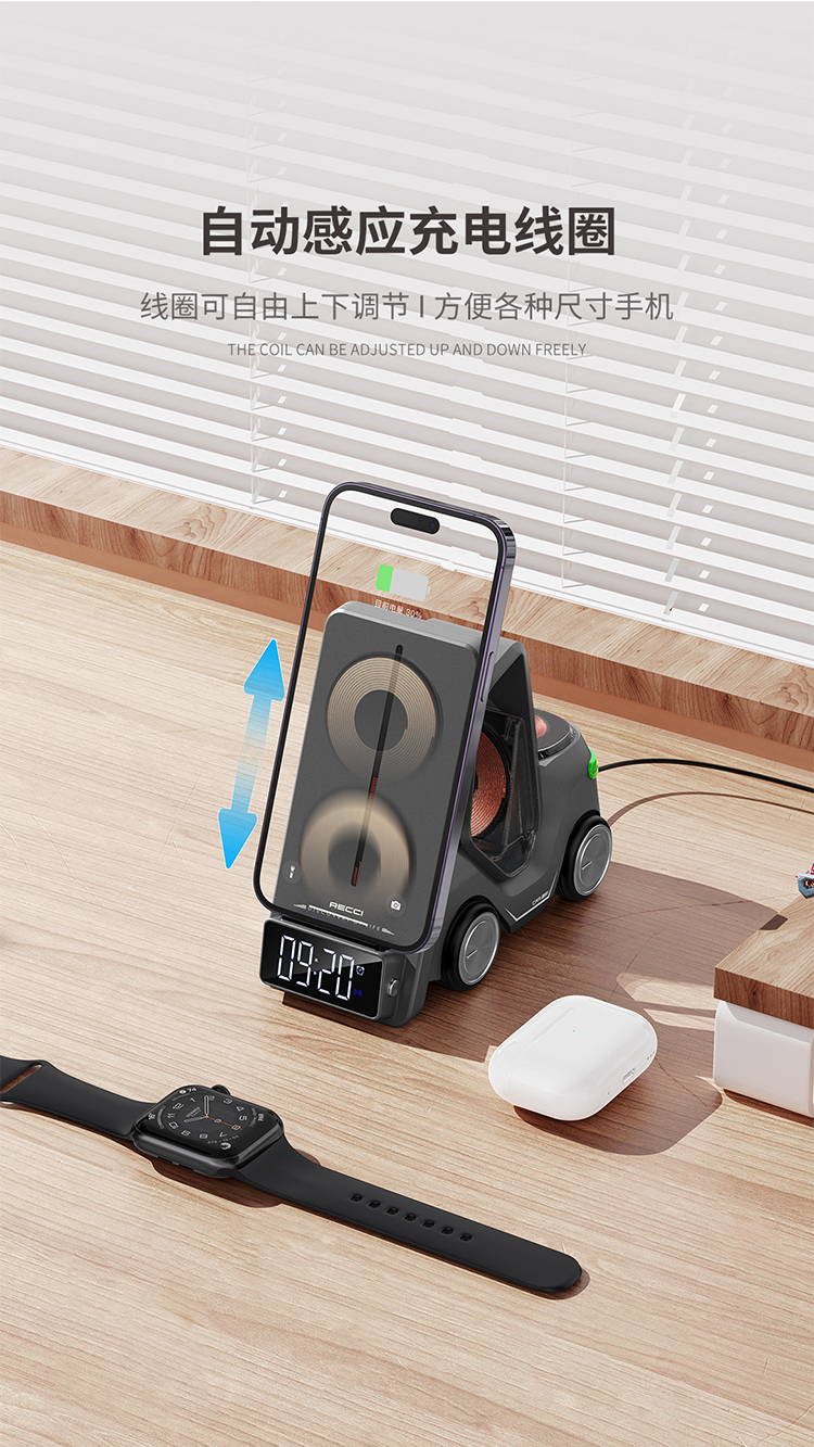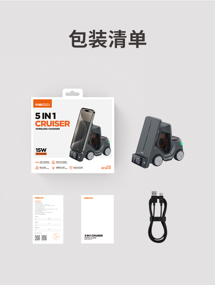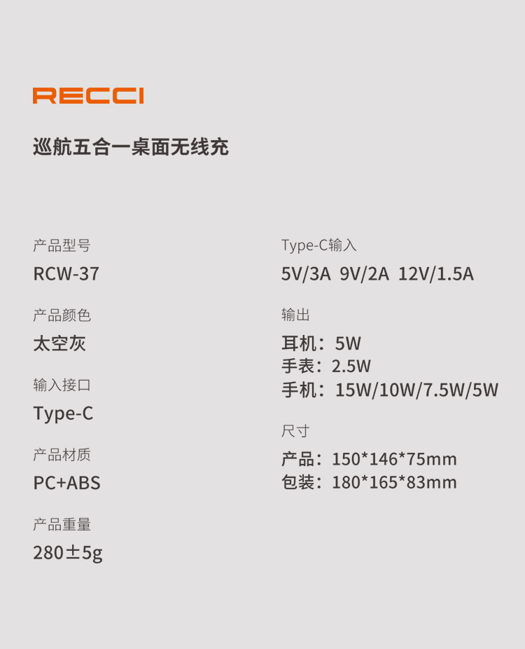 RECCI锐思RCW-37手机无线充电耳机无线充电磁吸7.5W/15W巡航五合一智能无线充炫酷兼容手机磁吸通用