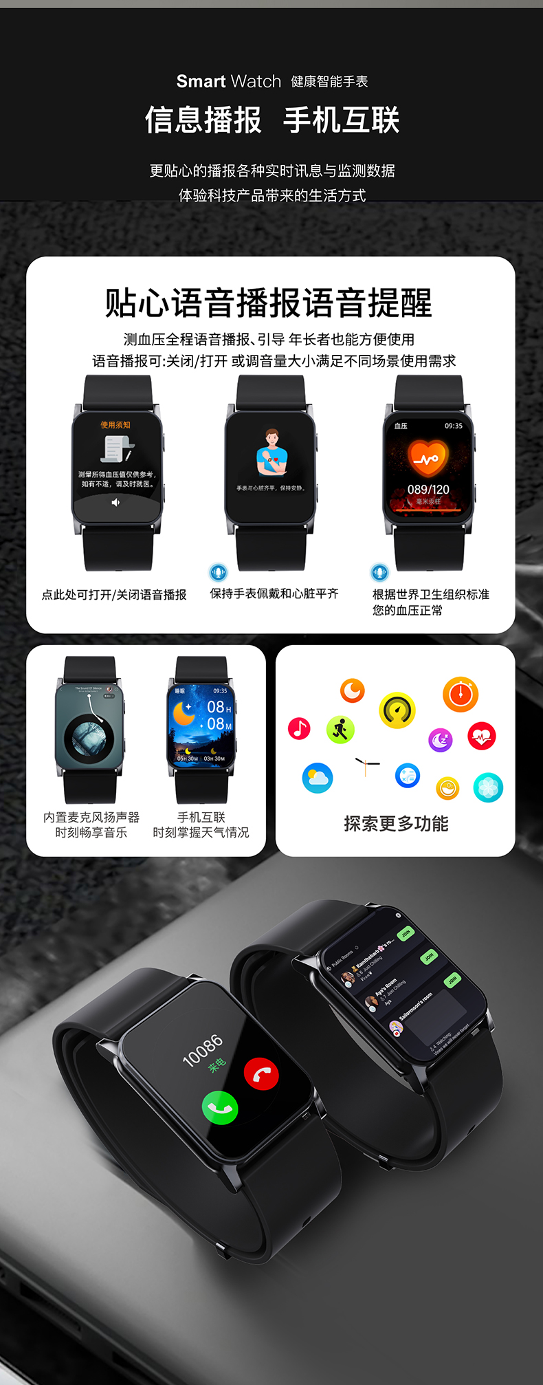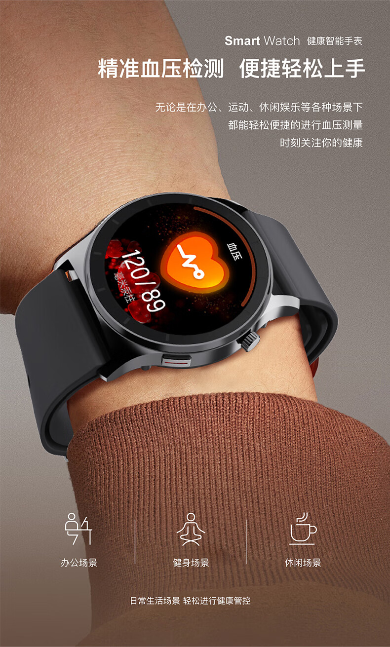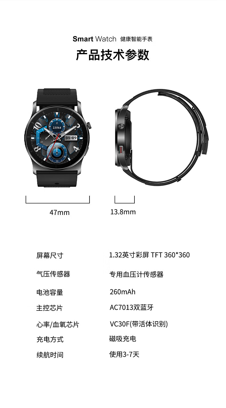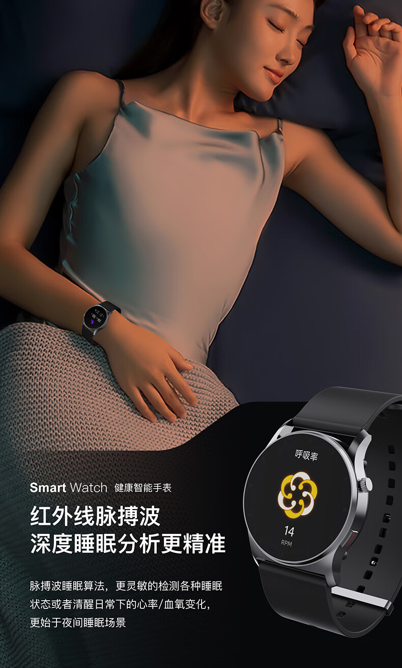 1,内置气泵与气囊,精准血压,血氧,心率,睡眠质量等测量。