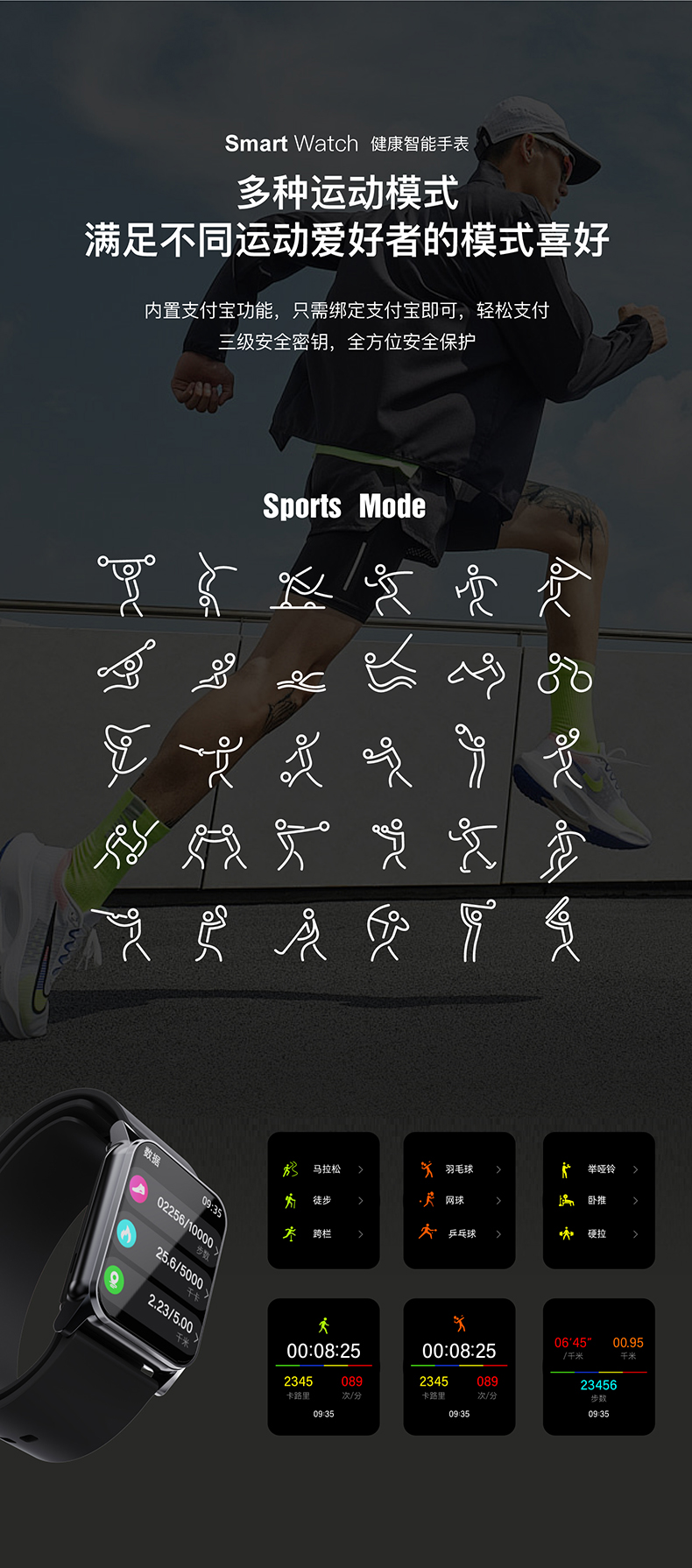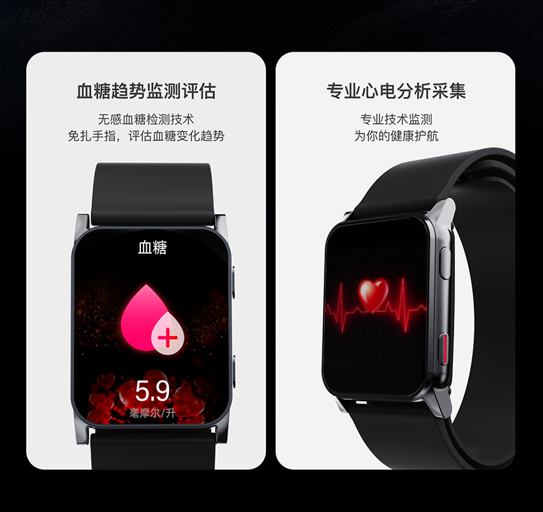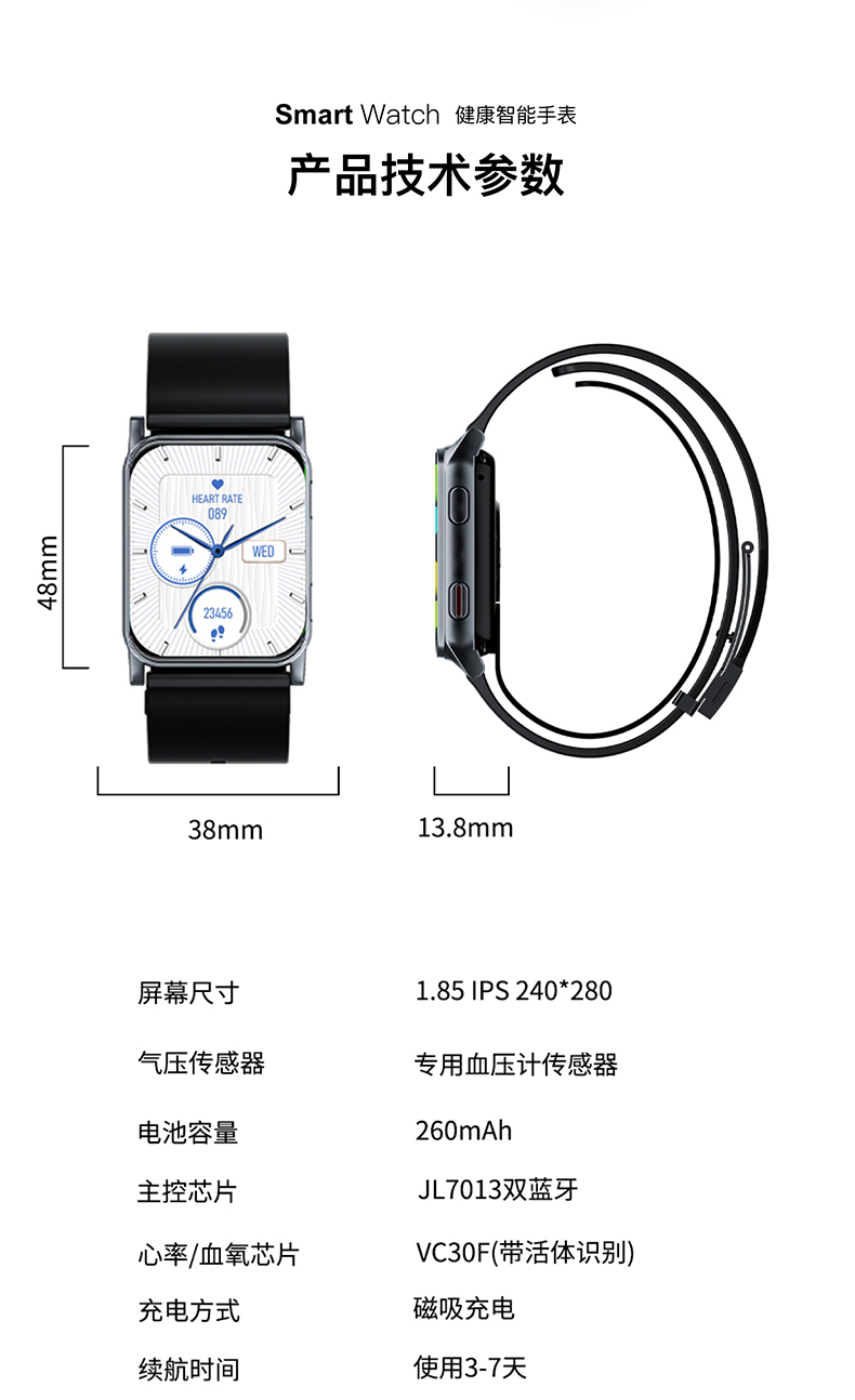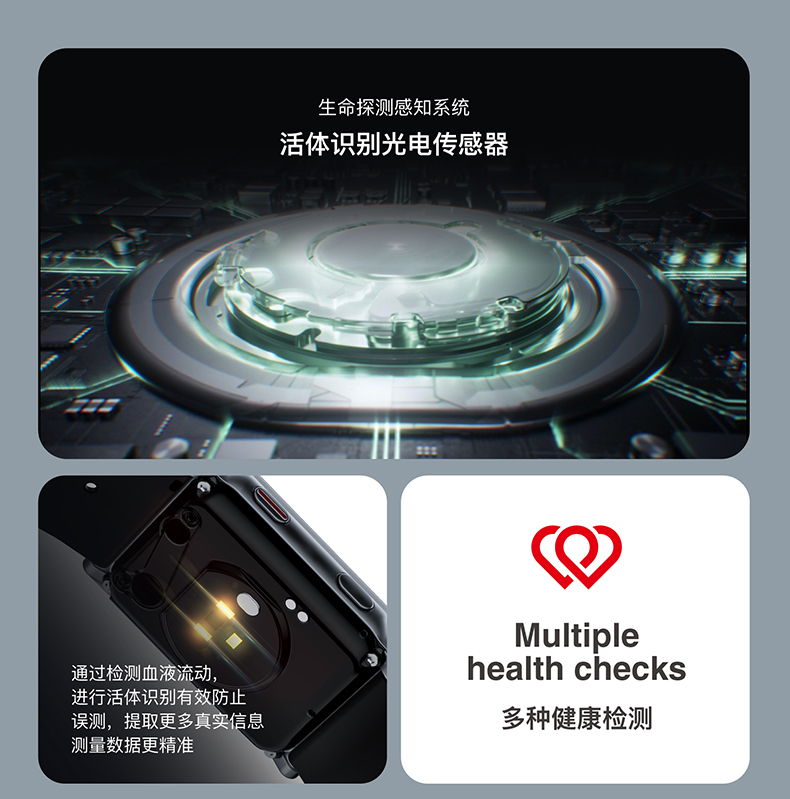 1,内置气泵与气囊,精准血压,血氧,心率,睡眠质量等测量。