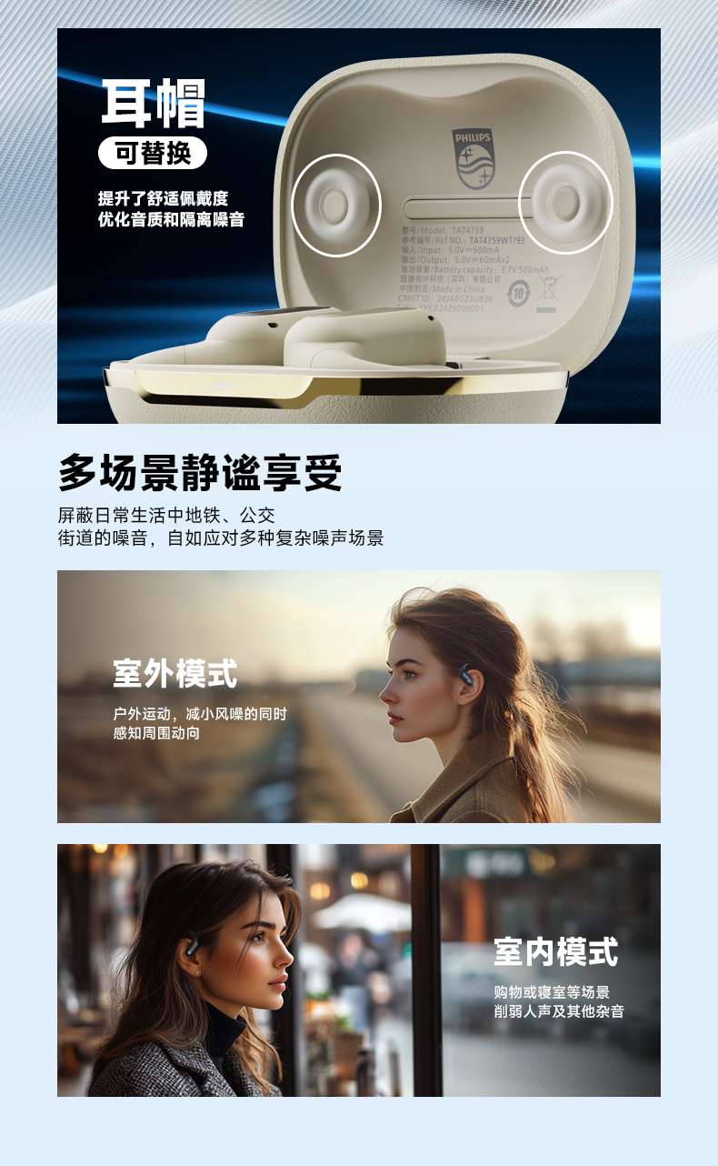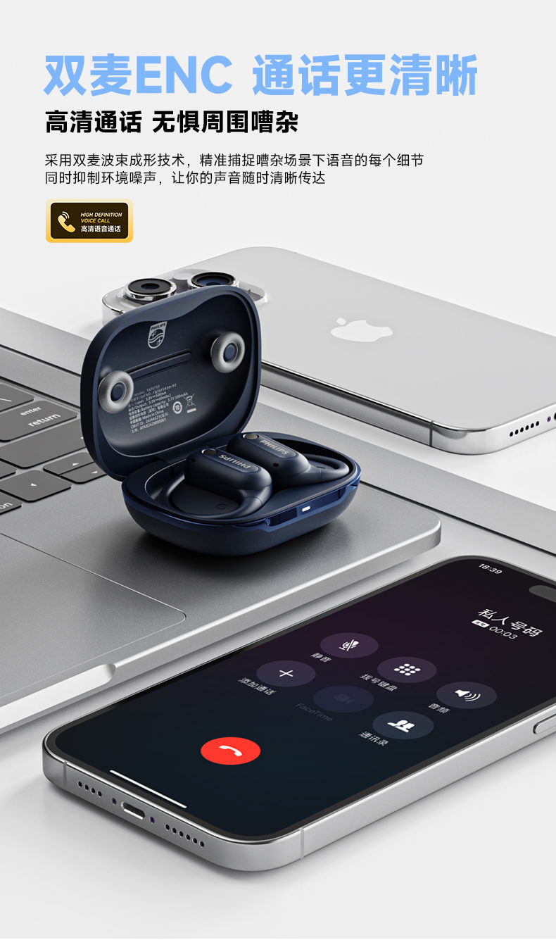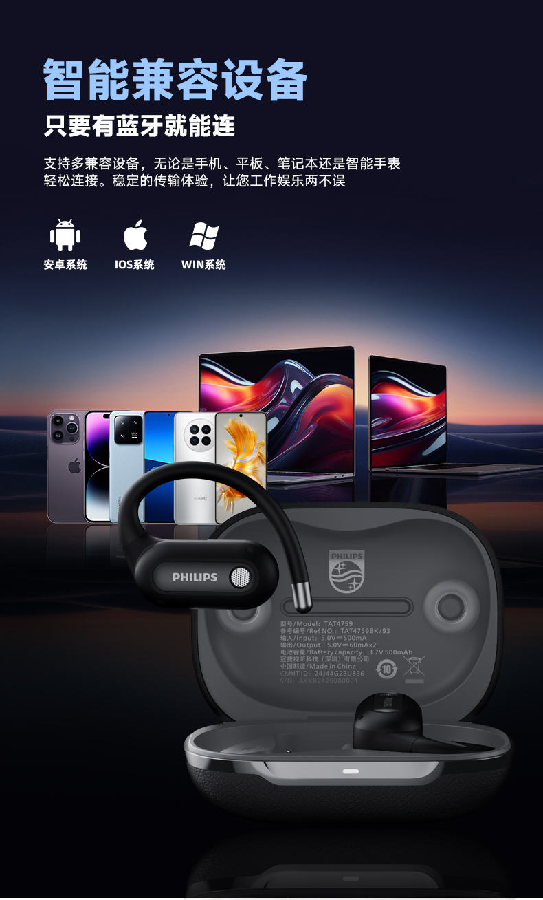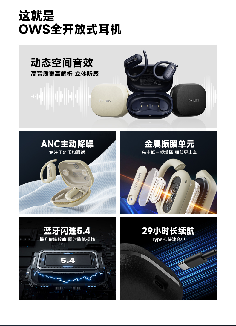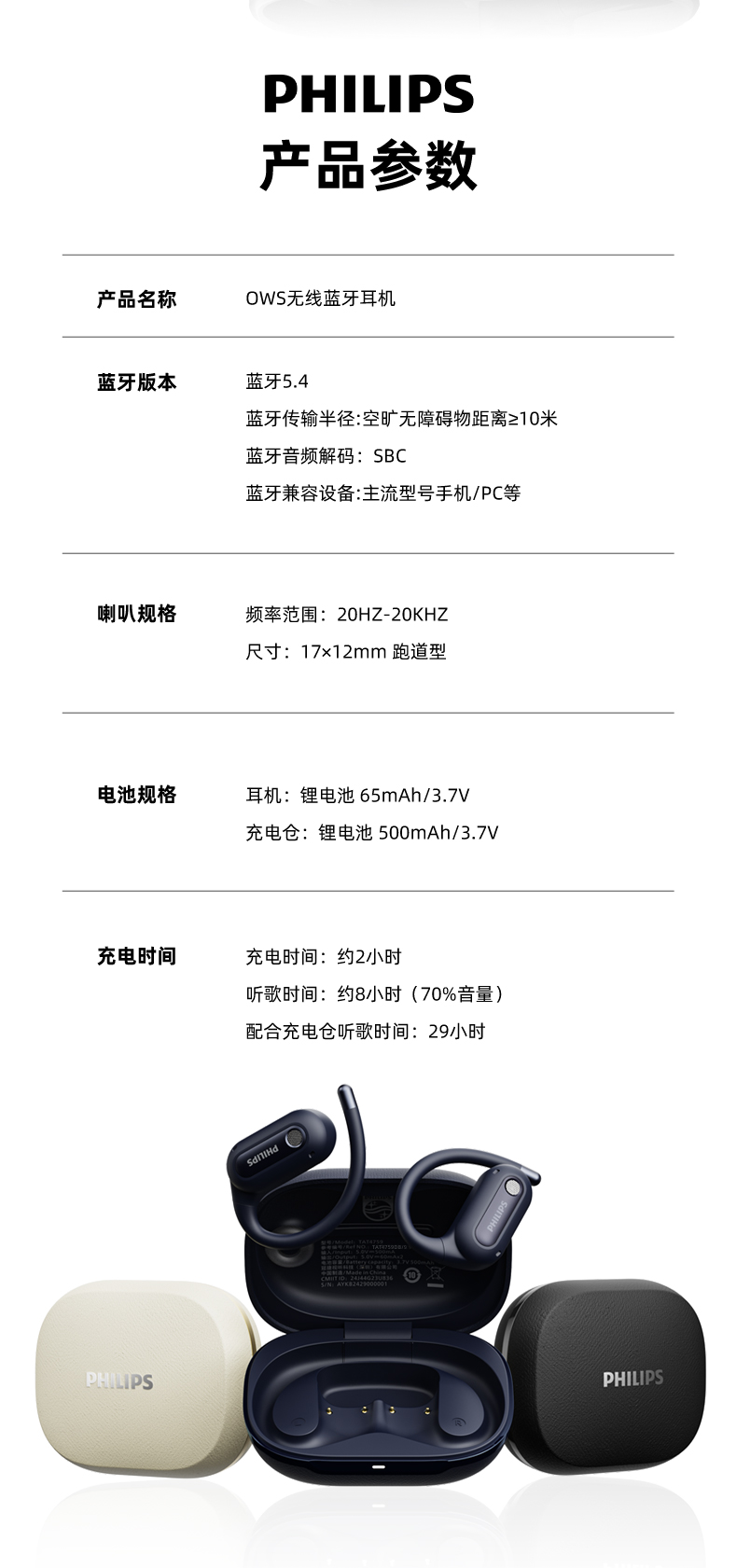 飞利浦(PHILIPS)蓝牙耳机骨传导概念真无线挂耳式开放式不入耳运动跑步长续航高端降噪耳机(新款)TAT4759