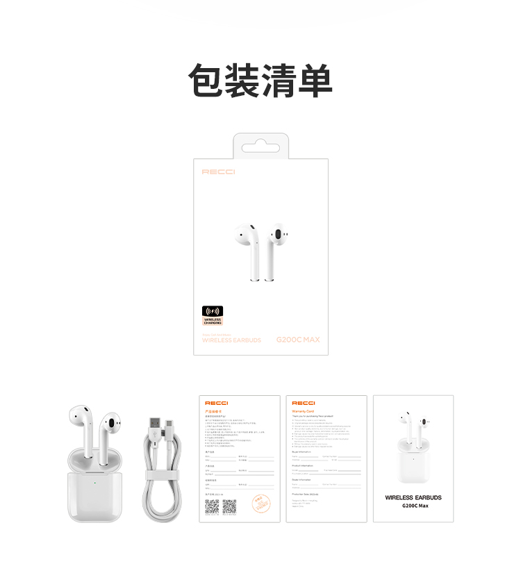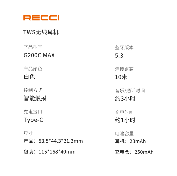 RECCIRECCI锐思G200C MAX二代尺寸蓝牙无线耳机通话清晰稳定佩戴舒适适用苹果安卓