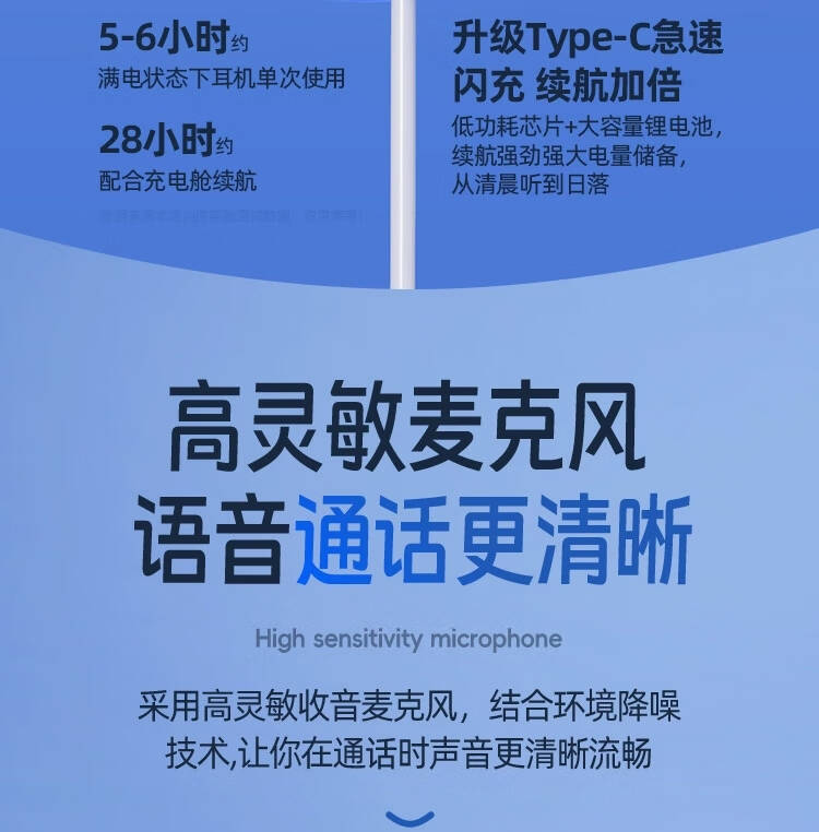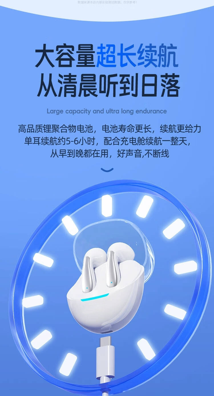 3,大容量超长续航,单耳就可满足整天的视听使用; 4,升级智能降噪,高敏麦克风,通话更清晰;