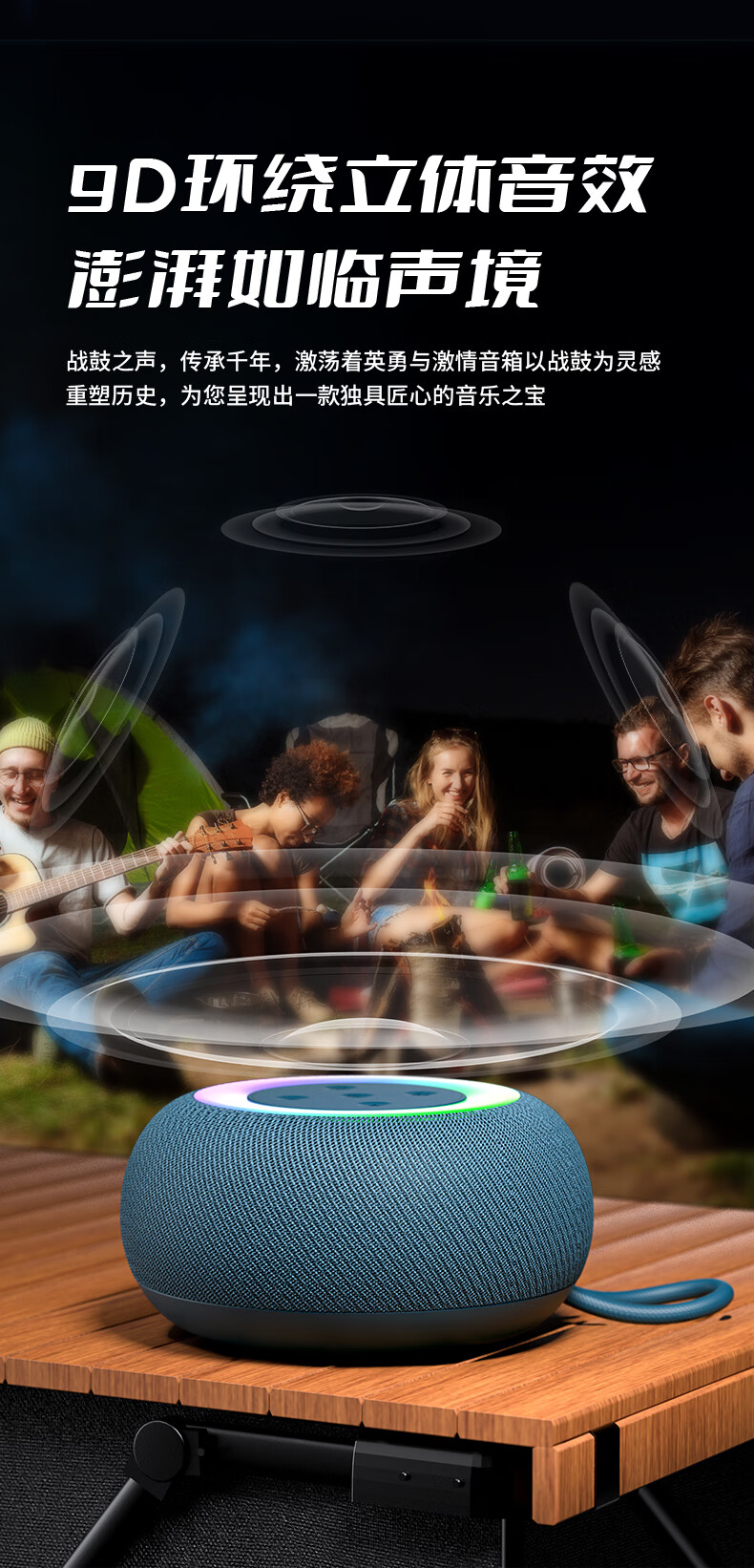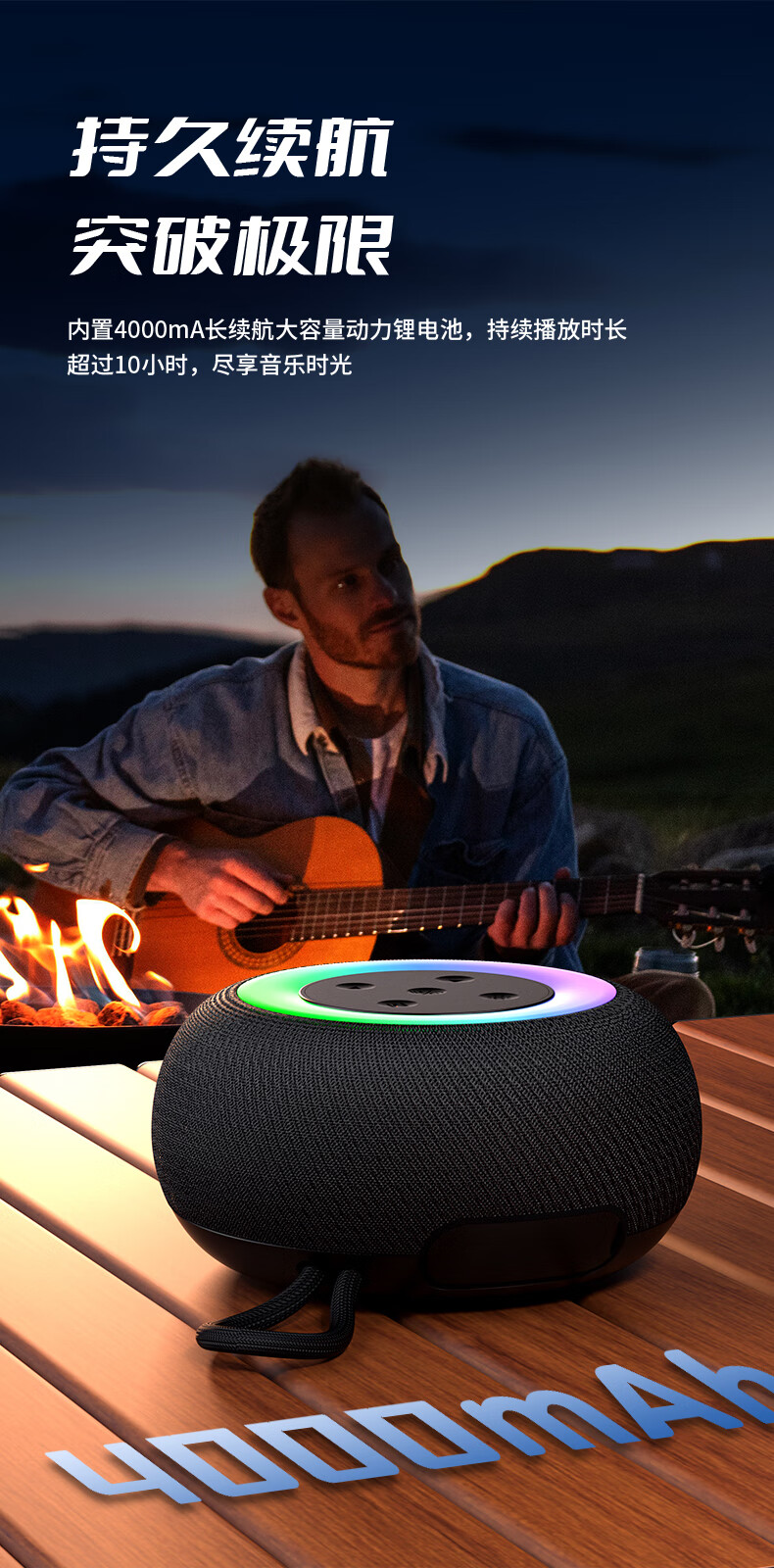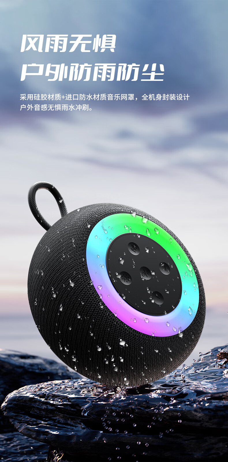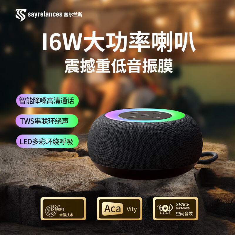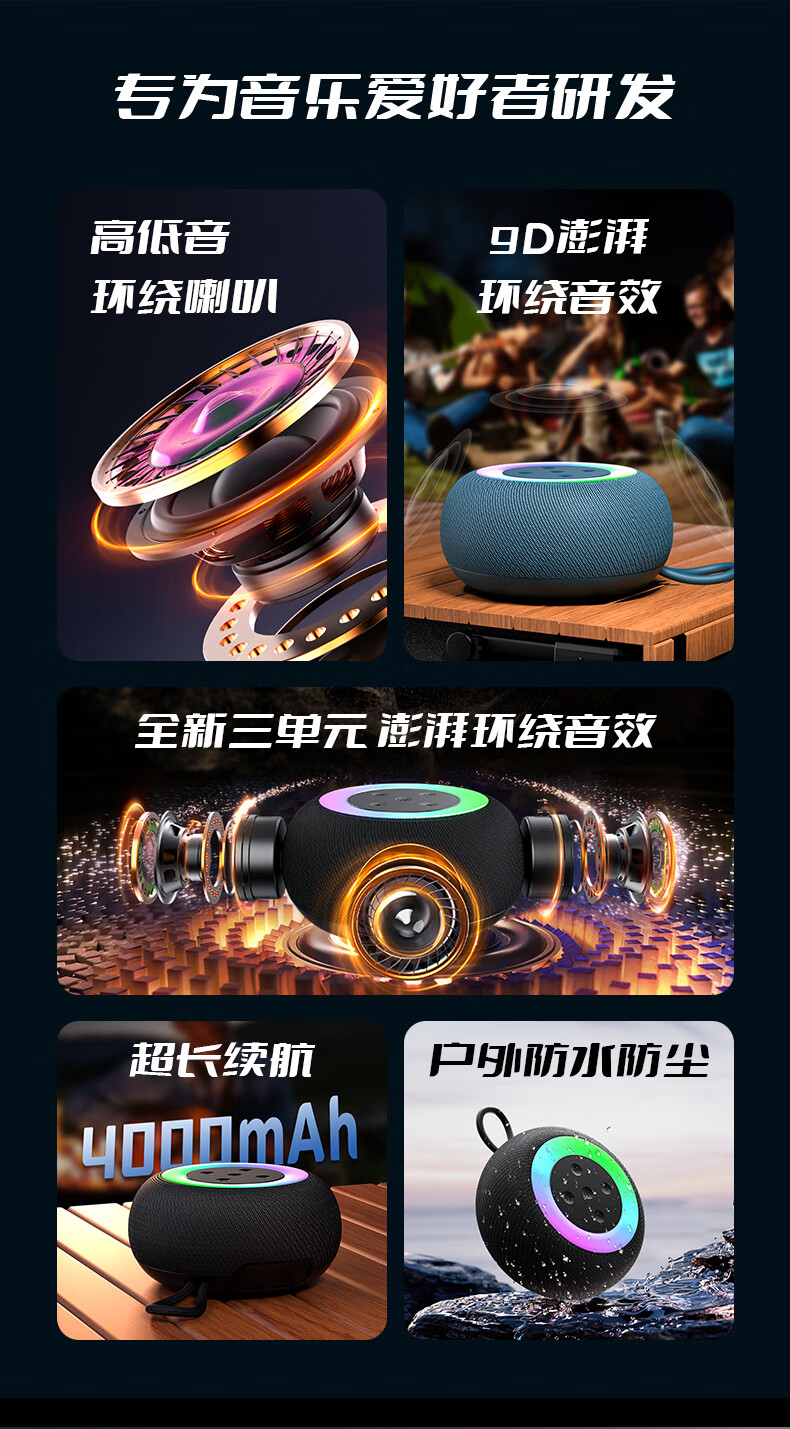 1,户外桌面音箱,16W大功率,震撼重低音振膜; 2,智能降噪高清通话; 3,TWS串联杜比环绕声,意思可两台同时连接。 4,LED七彩灯光环绕呼吸; 5,4000mAh持久10小时续航,防水防尘, 6,可以蓝牙播放,TF卡播放,AUX播放,U盘播放。