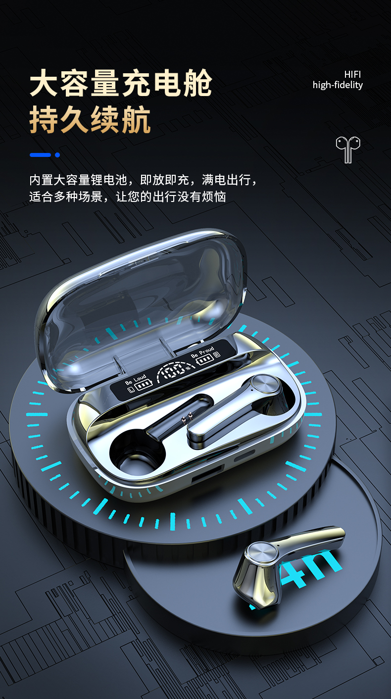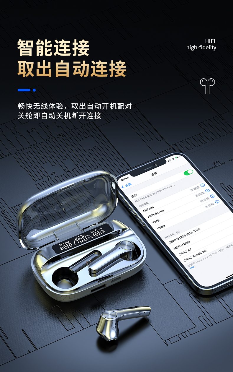 5,内置大容量鲤电池,即放即充,满电出行适合多种场景; 6,畅快无线体验,取出自动开机配对关舱即自动关机断开连接。