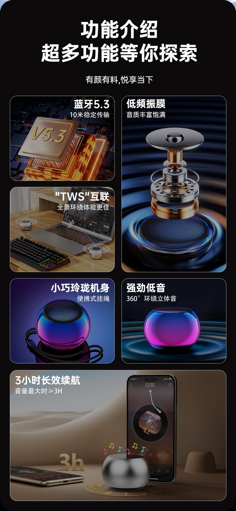 1,5.3版本低能耗畅连蓝牙,360度全向音响,全膜强劲低音 ;