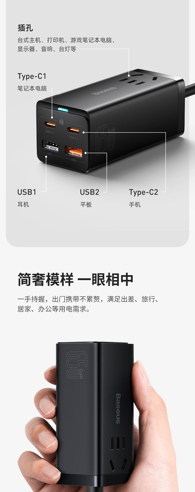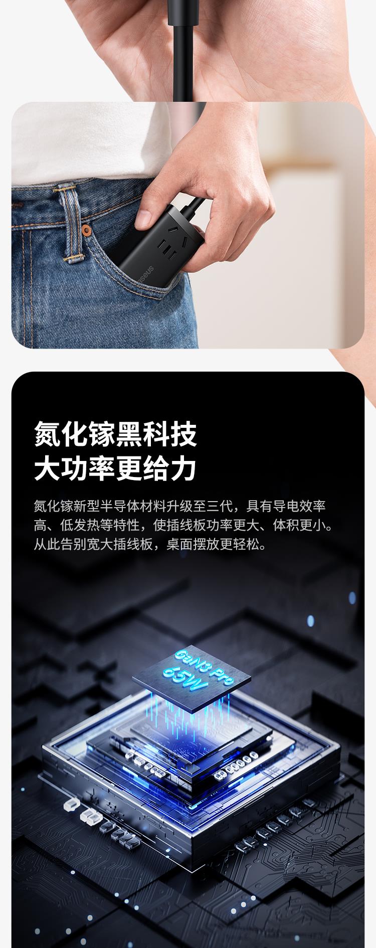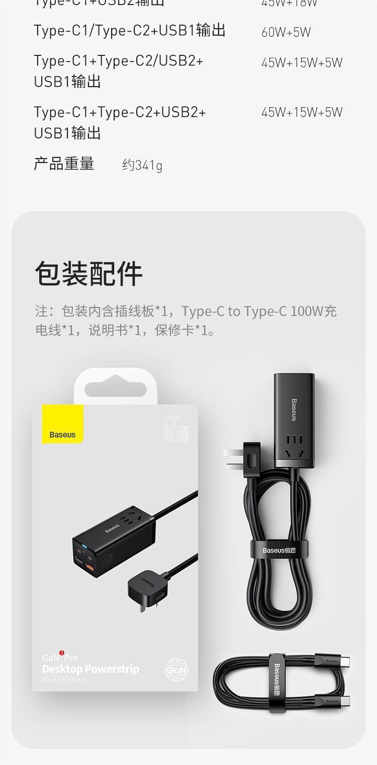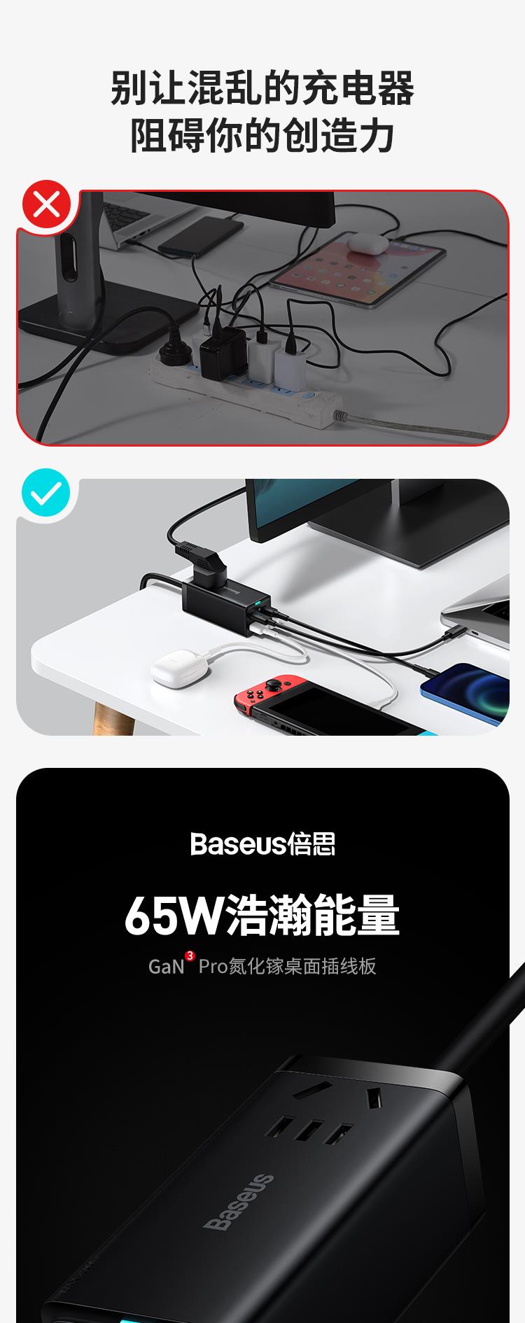 倍思GaN3pro氮化镓桌面插线板AC+2U+2C65W中规