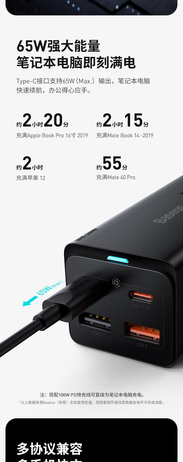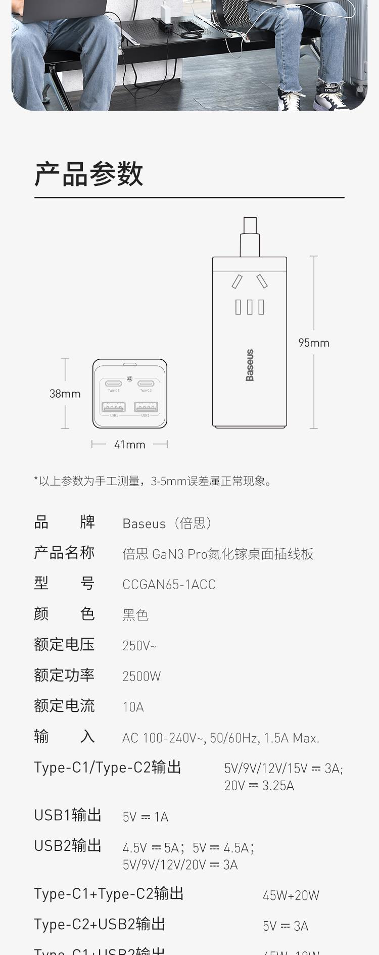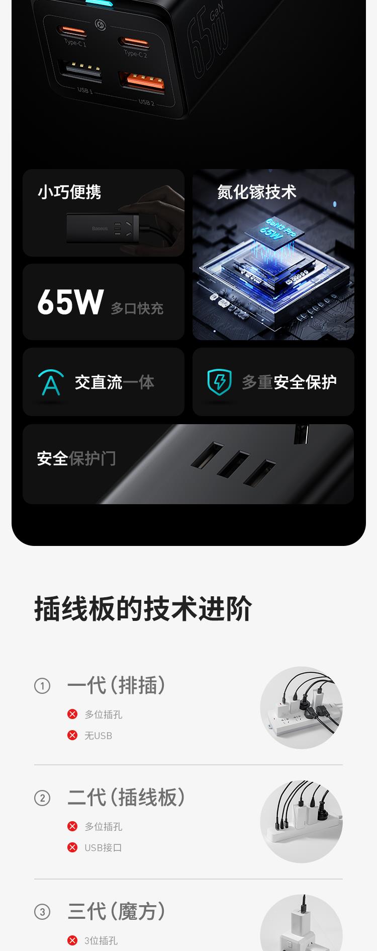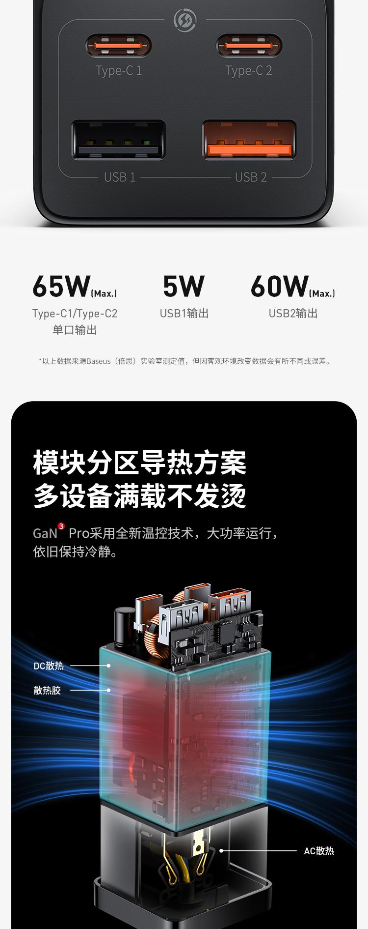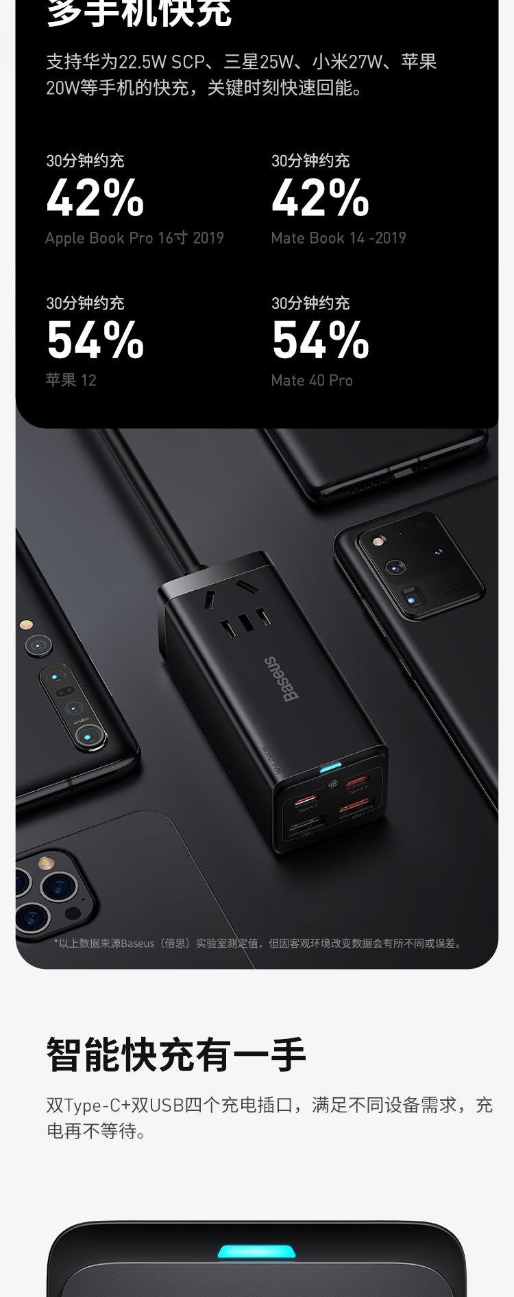 倍思GaN3pro氮化镓桌面插线板AC+2U+2C65W中规