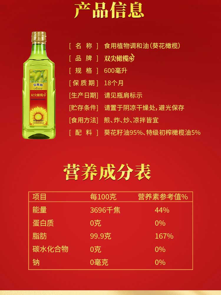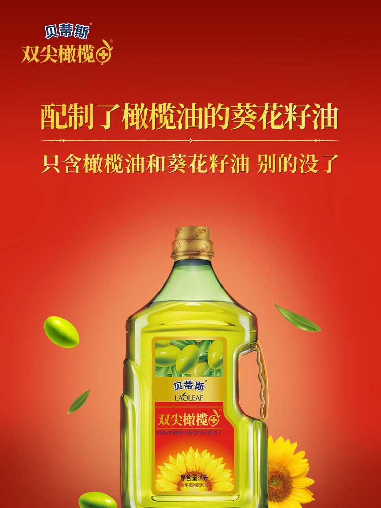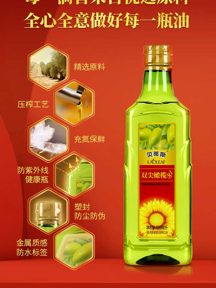 贝蒂斯食用植物调和油(葵花橄榄)600ML*1瓶装