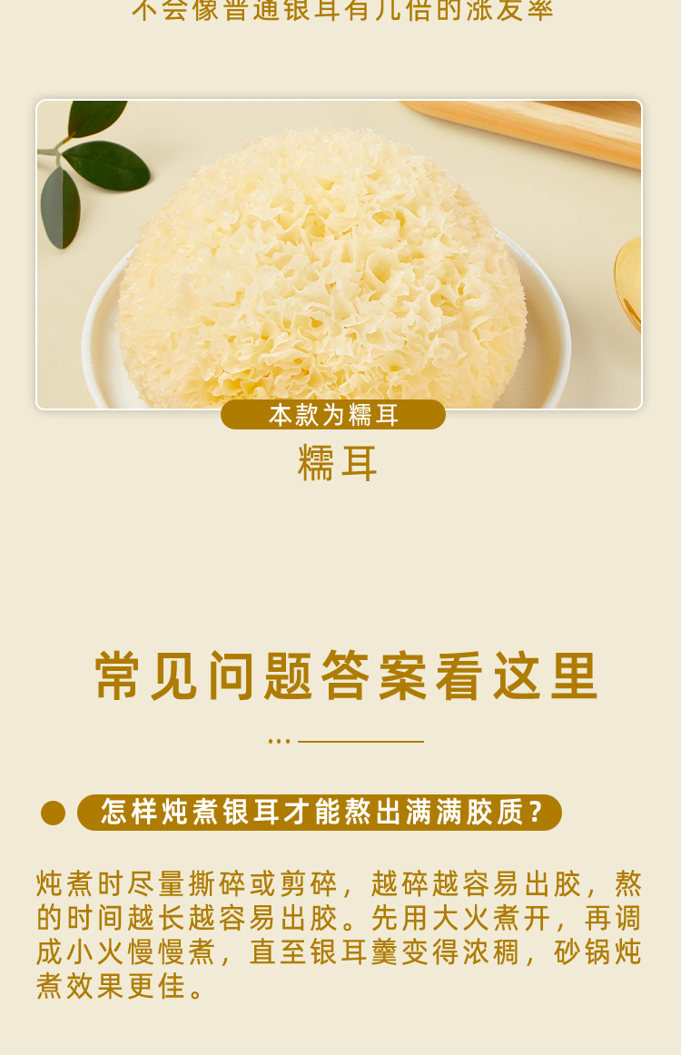 又称糯耳,软糯多胶,清香爽口,易煮易泡发,朵型紧致,小朵银耳,色泽微黄,保留糯耳原本微黄色泽,拒绝熏硫
