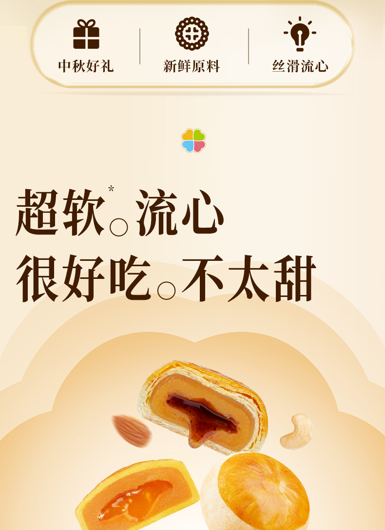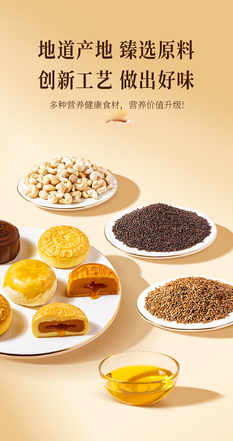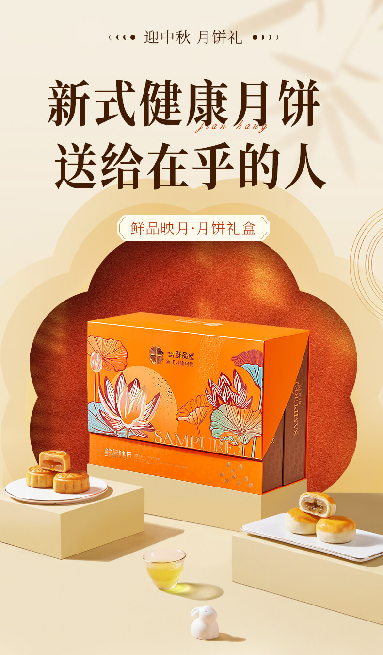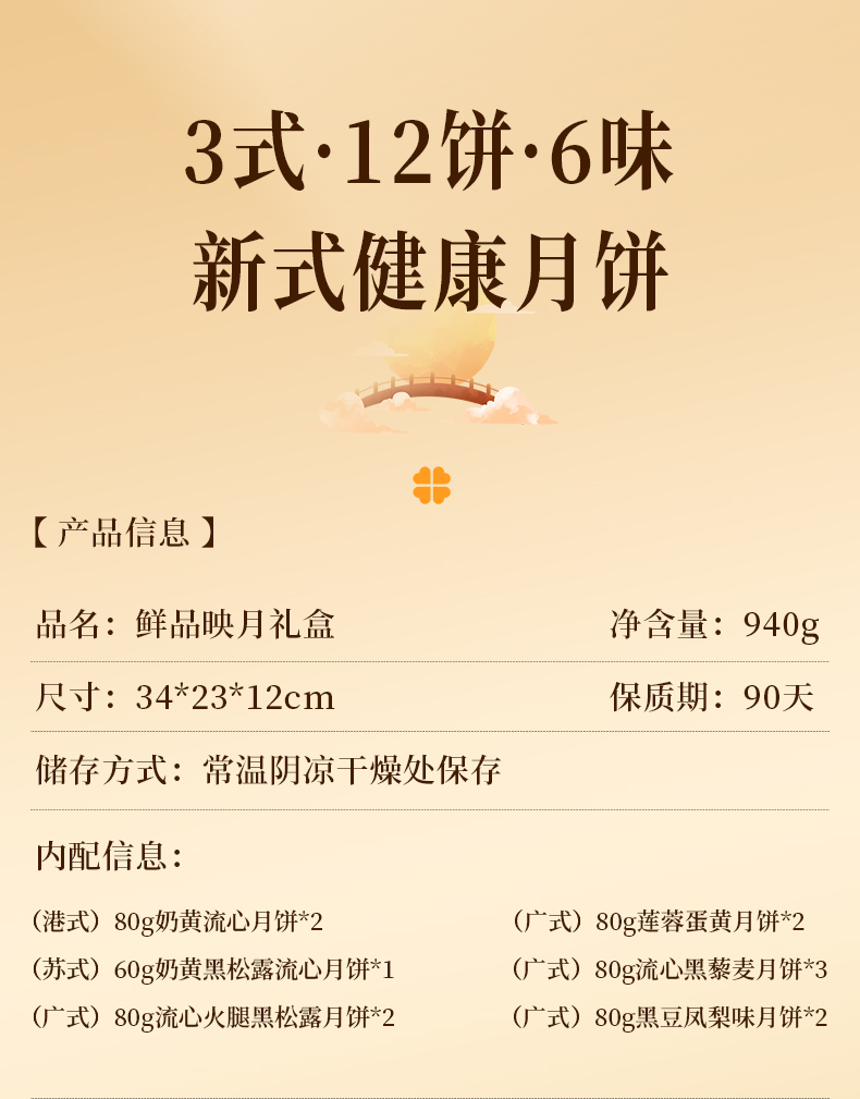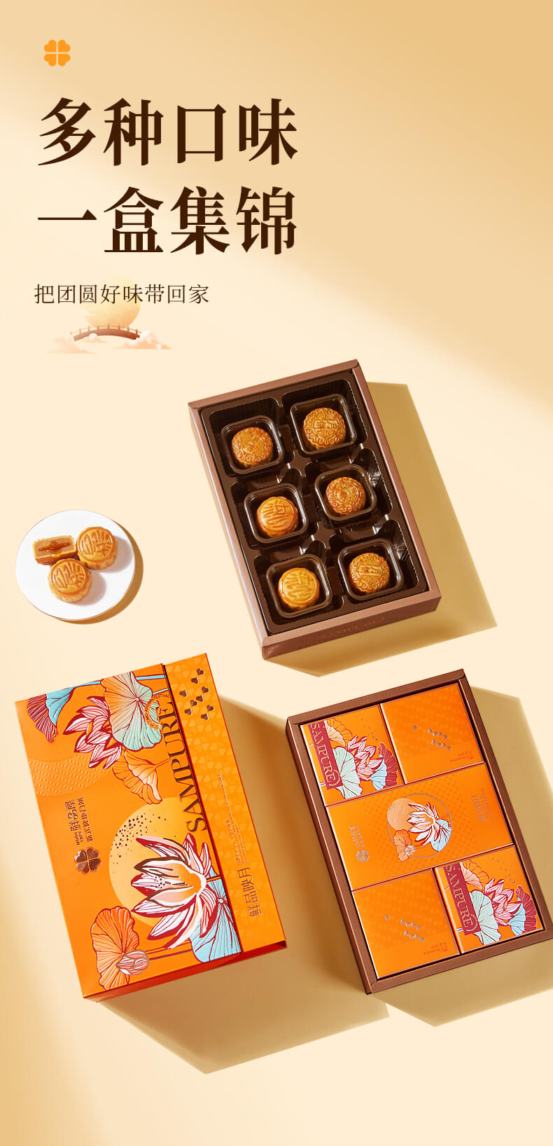 【卖点】:独特双层盒型,采用精巧斜面开启,绘成一幅清新雅致的画卷;内含3式8味12饼,苏式、港式、广式,三种风格月饼,传统与创新融合,是中秋馈赠、团圆分享的佳选。