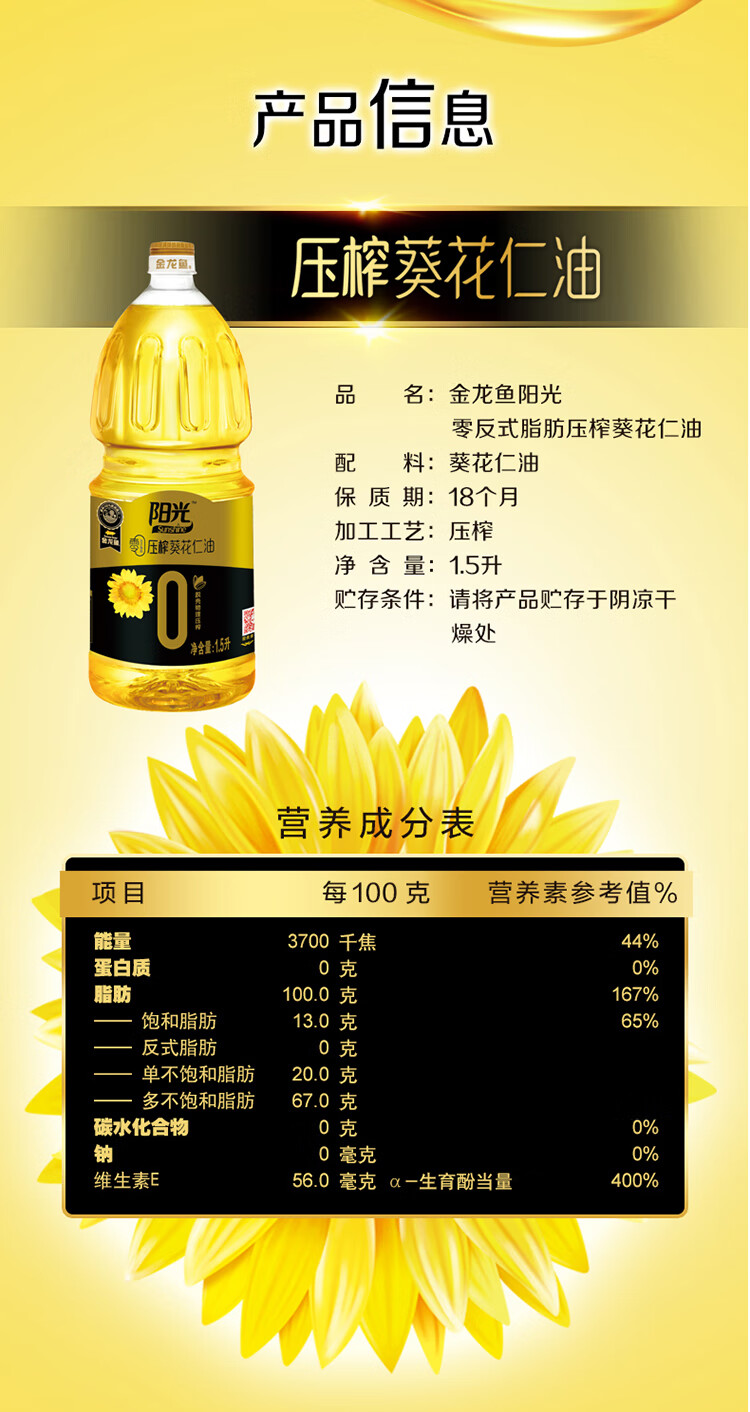 金龙鱼阳光零反式脂肪压榨葵花仁油/压榨/特级/1.5L
