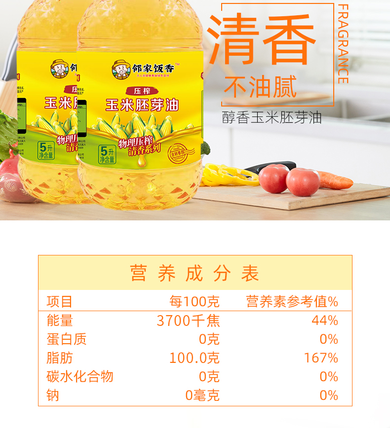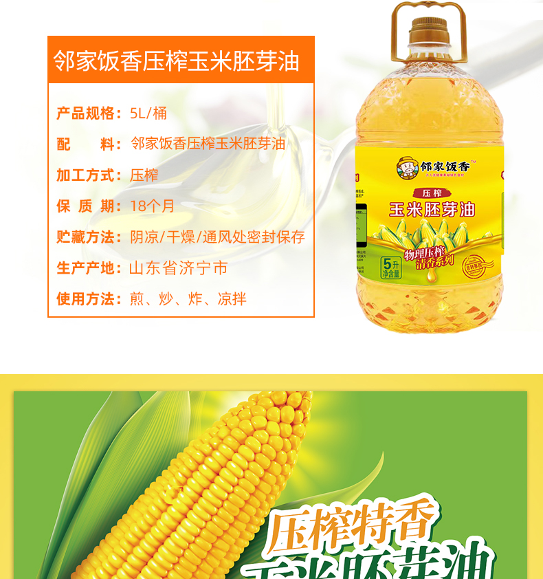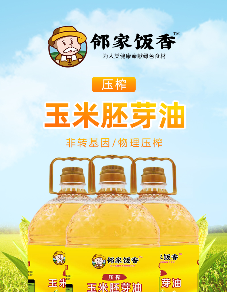 邻家饭香 非转基因 物理压榨一级玉米胚芽油 5L/桶 LJFX135-Y