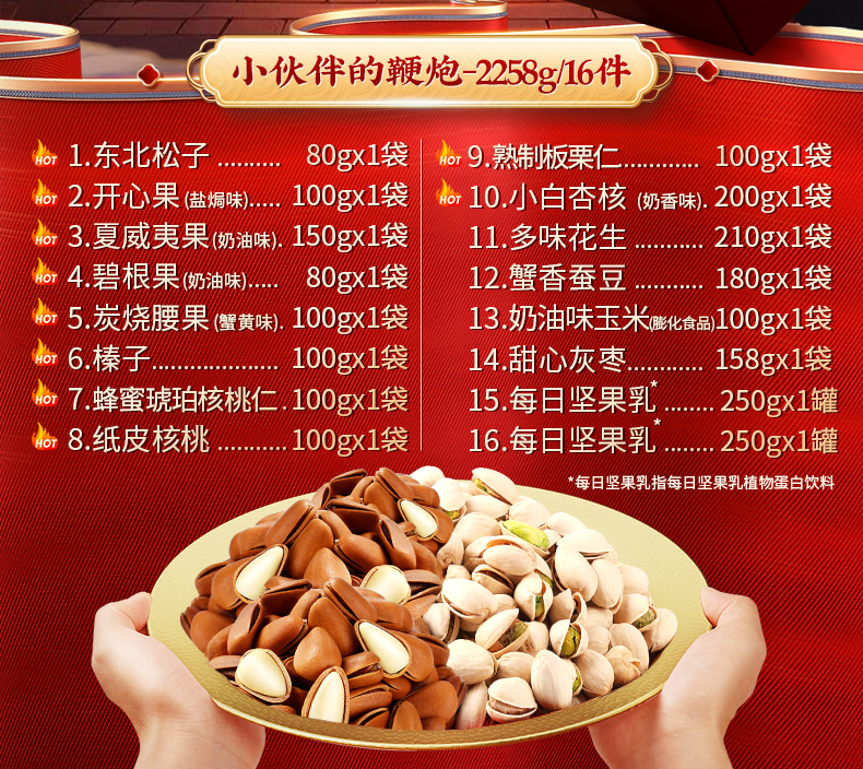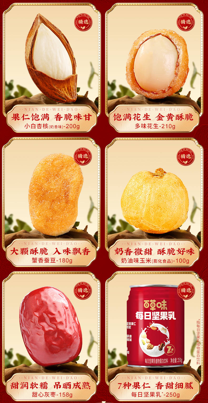 【百草味】开心果(盐焗味)100g/【百草味】东北松子 80g/【百草味】夏威夷果(奶油味) 150g/【百草味】碧根果(奶油味) 80g/【百草味】榛子 100g/【百草味】炭烧腰果(蟹黄味)100g/【百草味】纸皮核桃 100g/【百草味】小白杏核(奶香味)200g/【百草味】熟制板栗仁 100g/【百草味】蜂蜜琥珀核桃仁 100g/【百草味】多味花生 210g/【百草味】蟹香蚕豆 180g/【百草味】奶油味玉米 100g/【百草味】甜心灰枣 158g/【百草味】每日坚果乳 250g