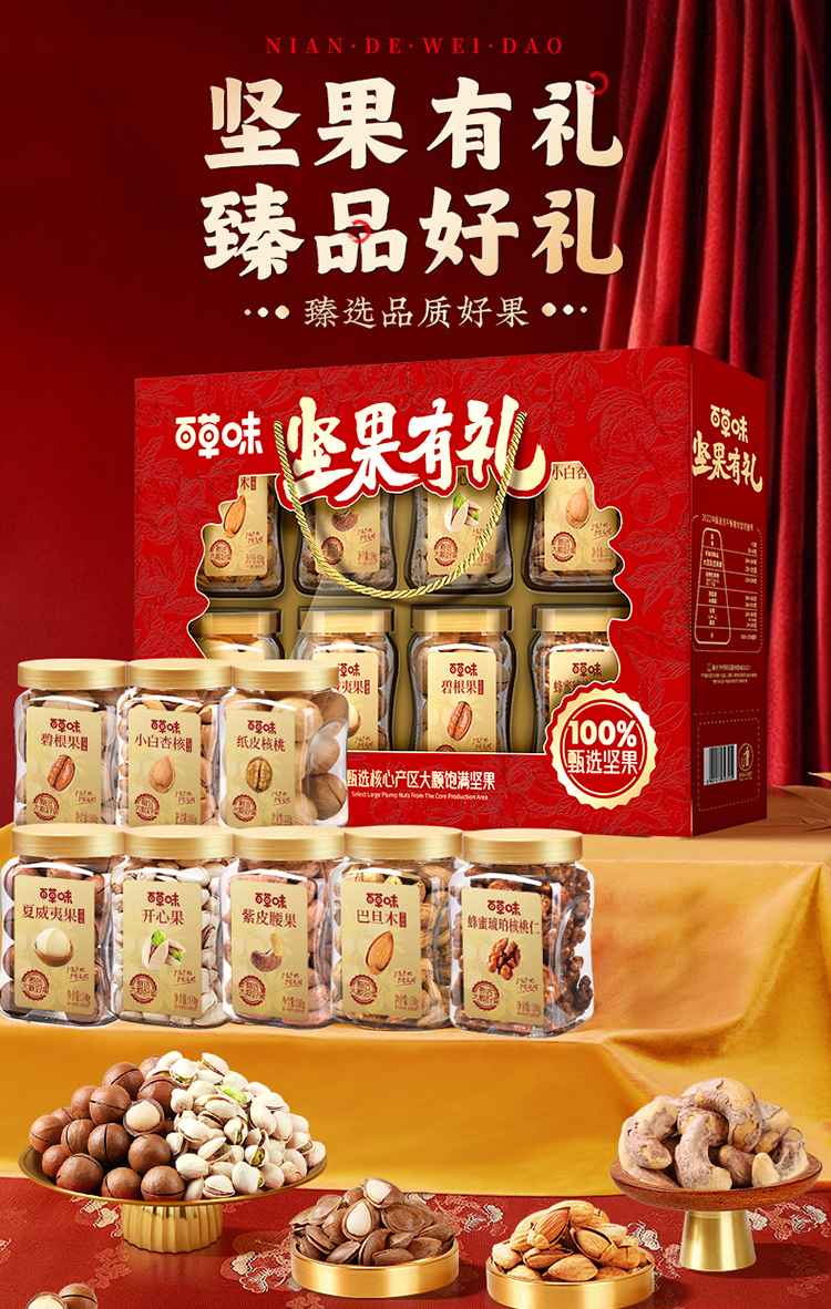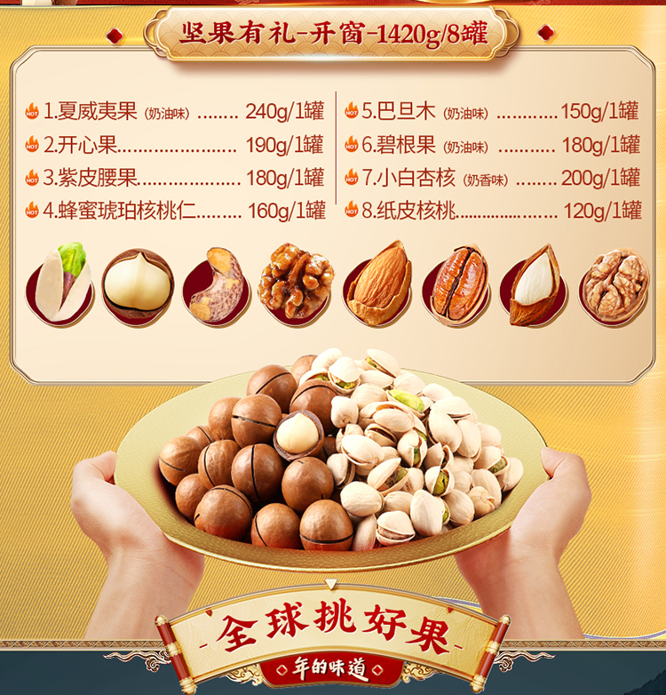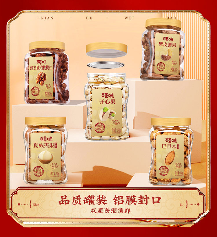 【百草味】夏威夷果(奶油味)240g/【百草味】开心果 190g/【百草味】紫皮腰果 180g/【百草味】蜂蜜琥珀核桃仁 160g/【百草味】巴旦木(奶油味)150g/【百草味】碧根果(奶油味)180g/【百草味】小白杏核 200g/【百草味】纸皮核桃 120g