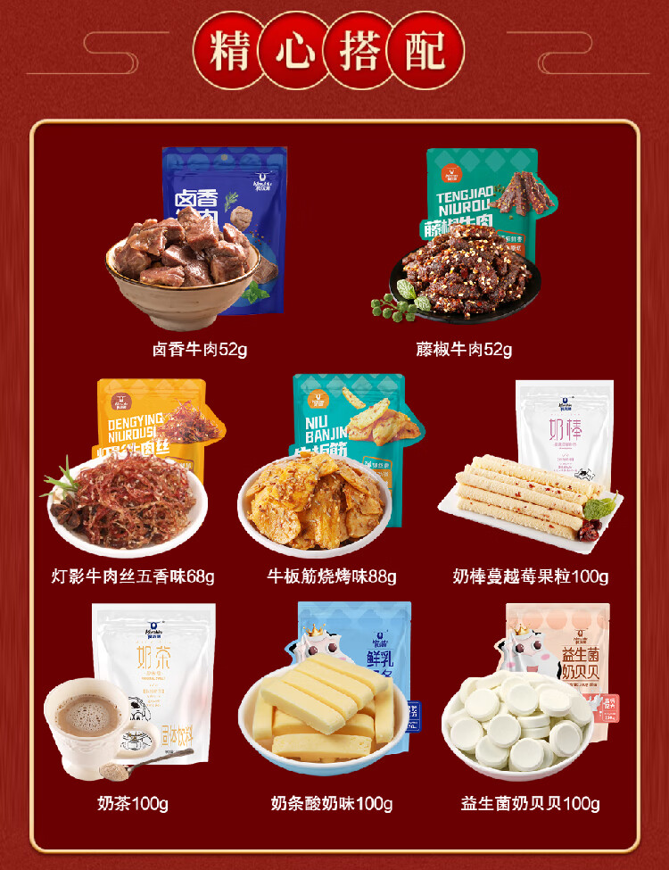 灯影牛肉丝68g五香味*1包牛板筋88g烧烤味(新)*1包鲜乳奶条100g*1包