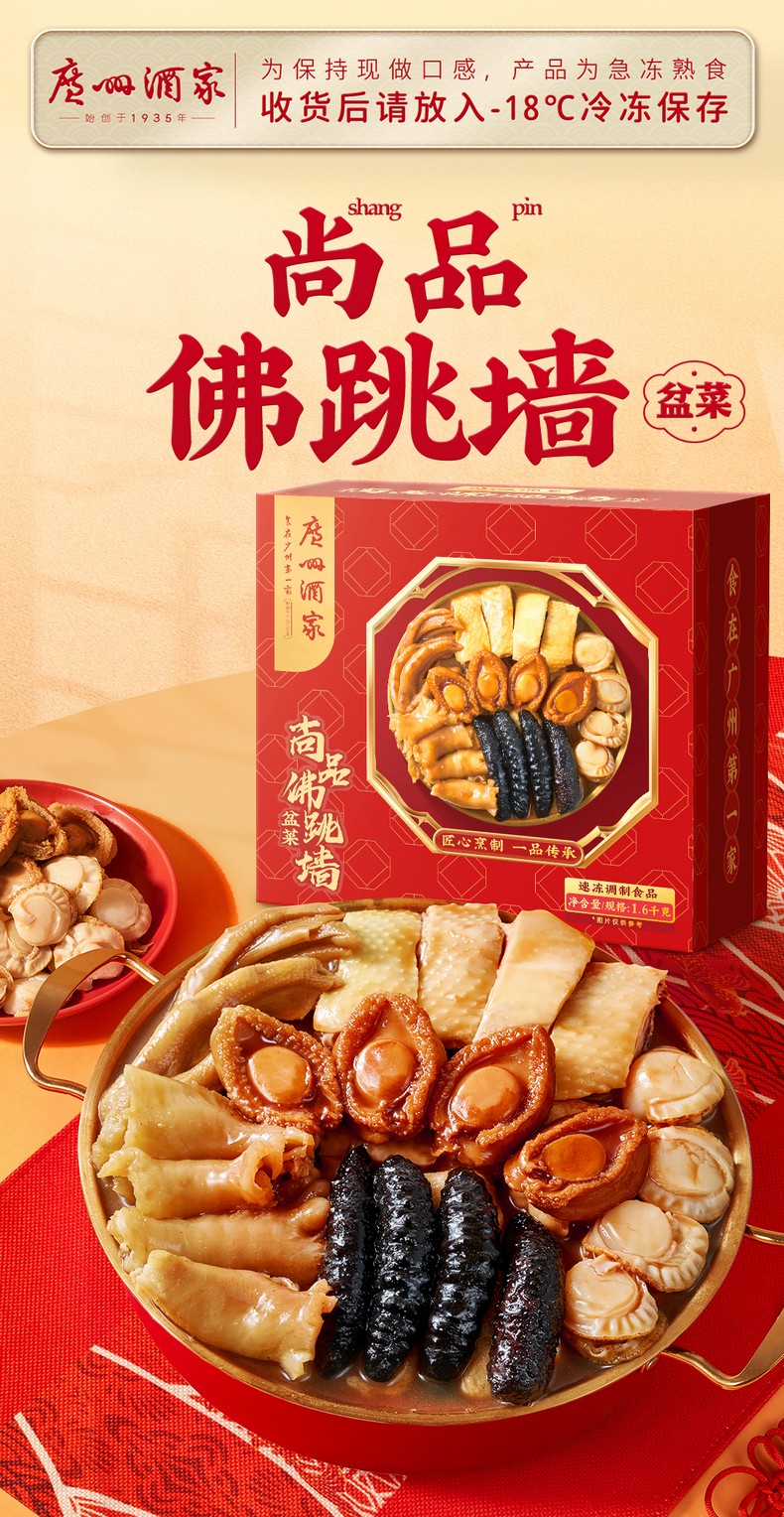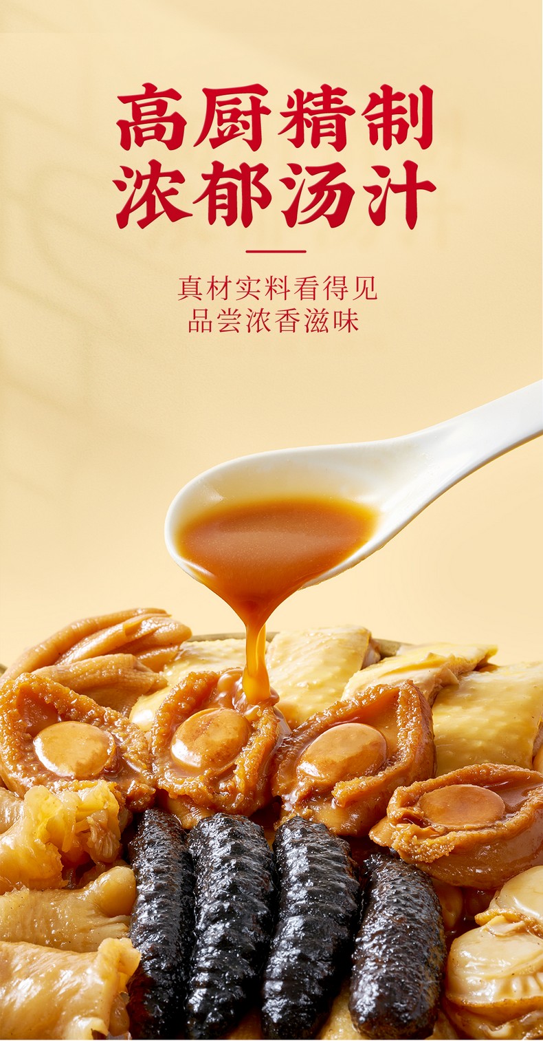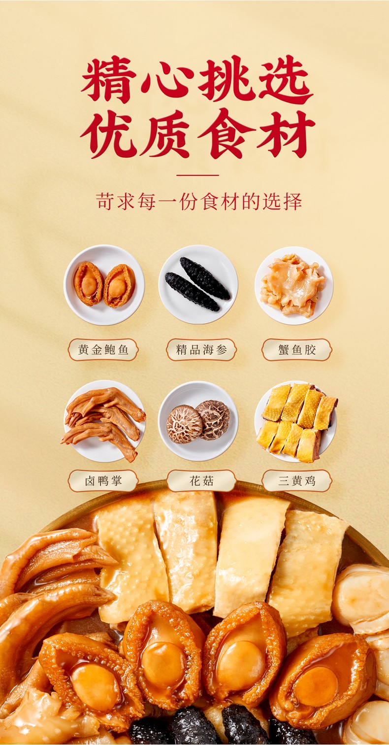 【广州酒家】海参(180-200头)、黄金鲍鱼(14-16克)、蟹鱼胶(30-40头)、帆立贝(40-60头)、卤鸭掌、鱼肉豆腐、三黄鸡肉、花菇仔、莲藕、鹰嘴豆、鲍汁