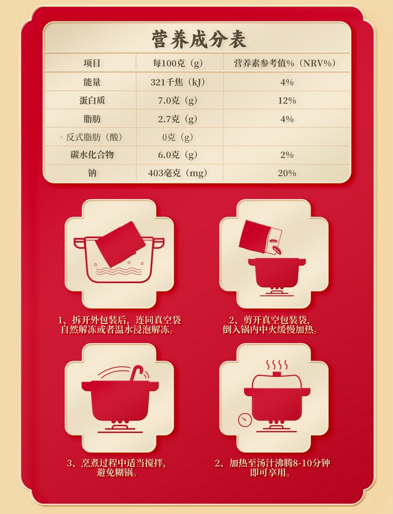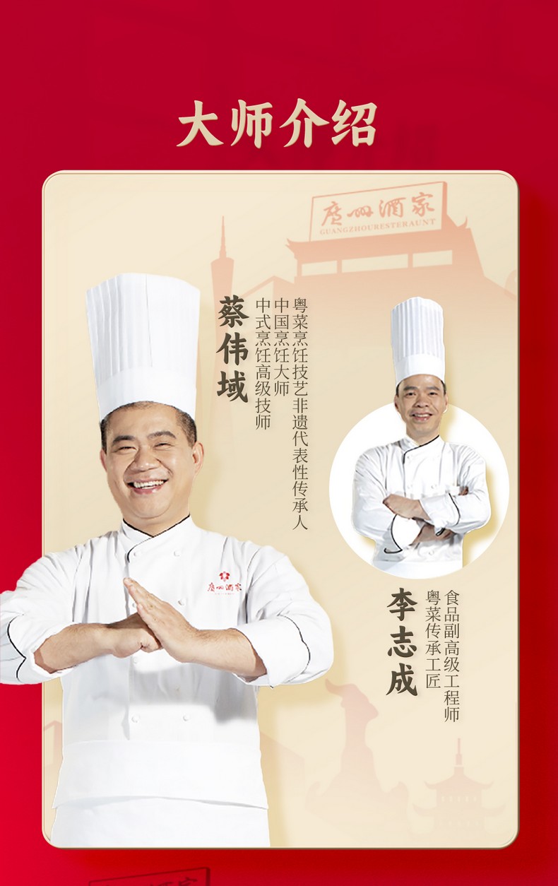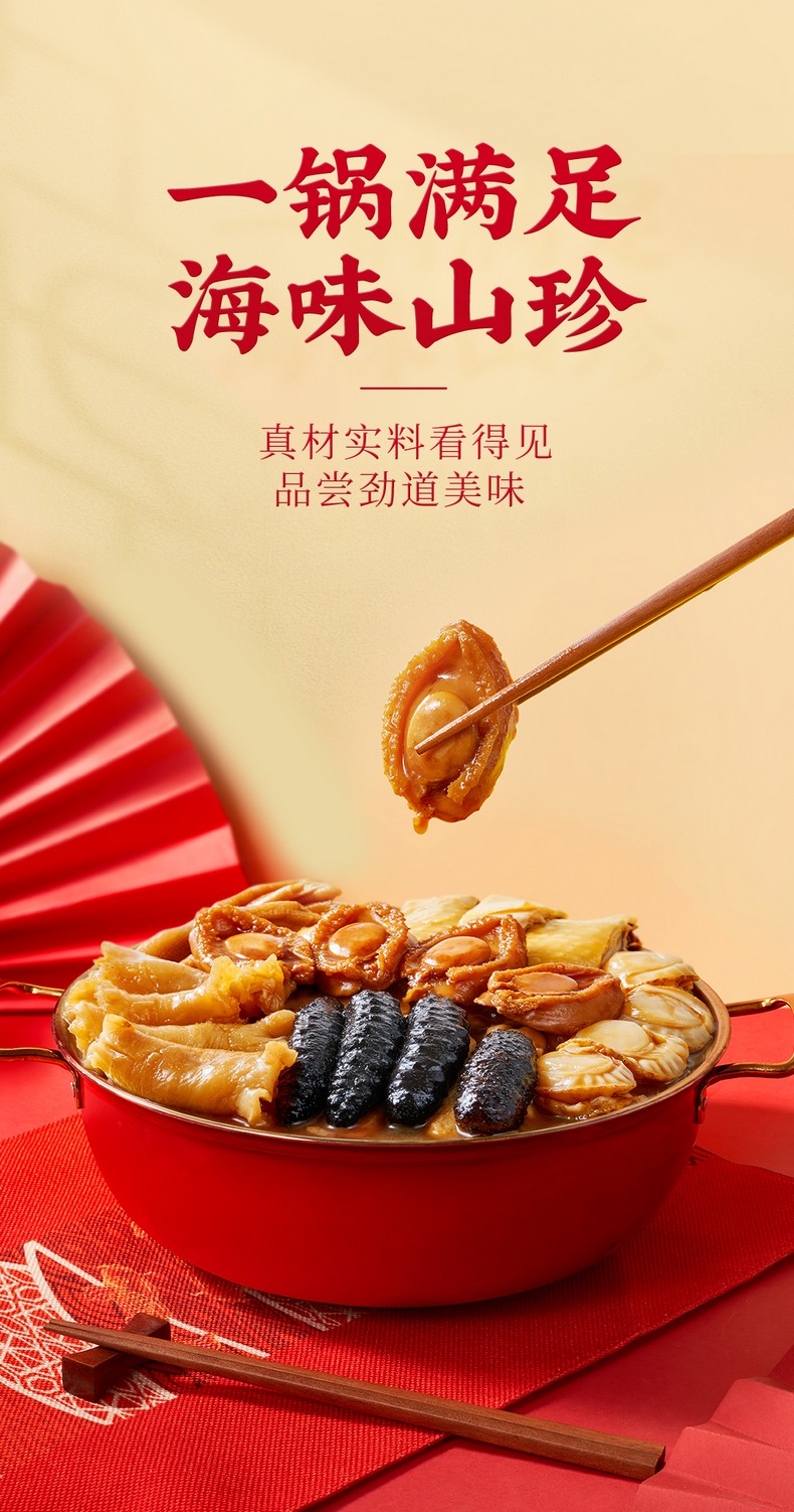 【广州酒家】海参(180-200头)、黄金鲍鱼(14-16克)、蟹鱼胶(30-40头)、帆立贝(40-60头)、卤鸭掌、鱼肉豆腐、三黄鸡肉、花菇仔、莲藕、鹰嘴豆、鲍汁