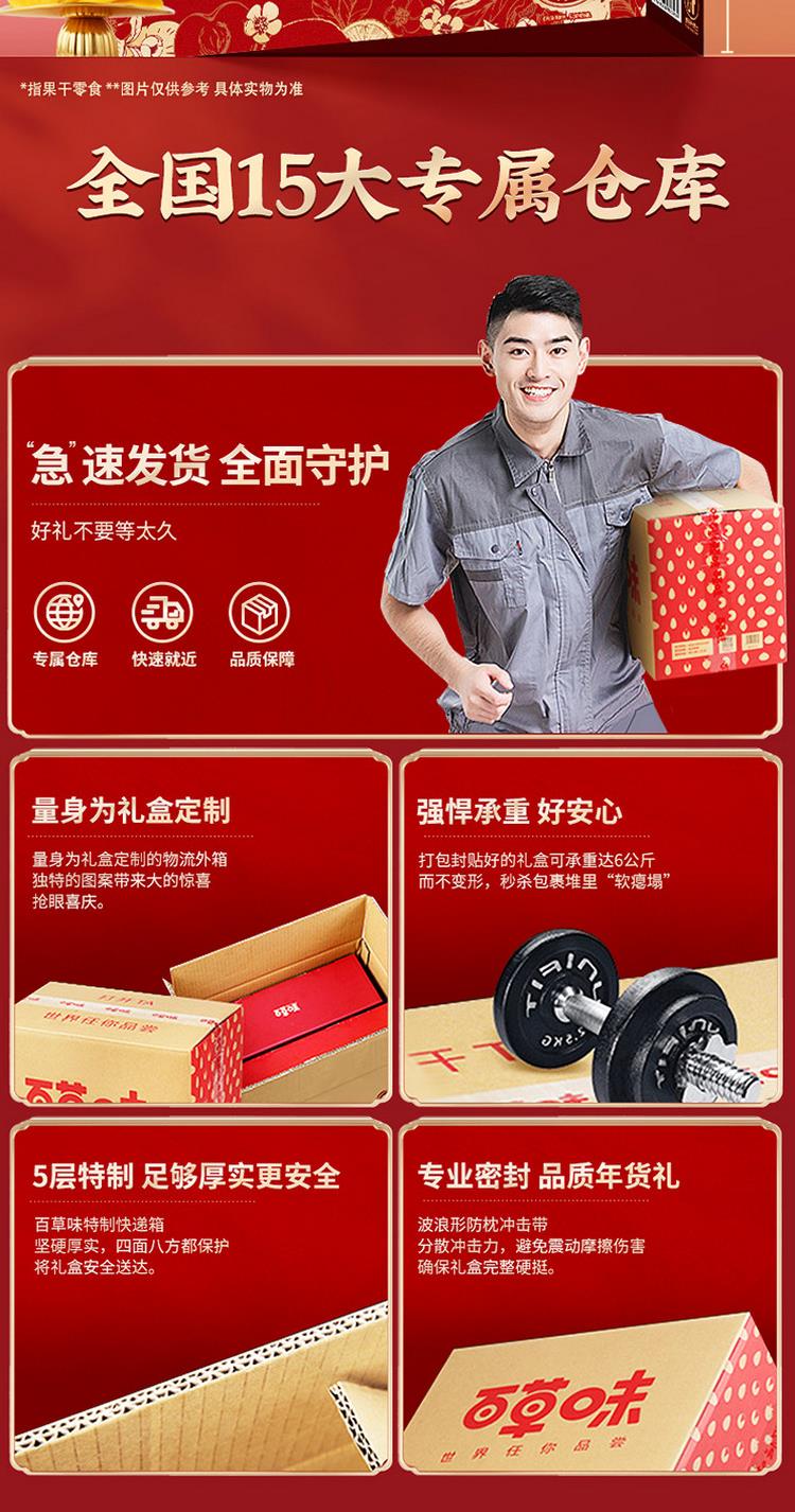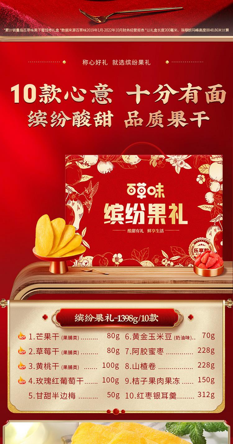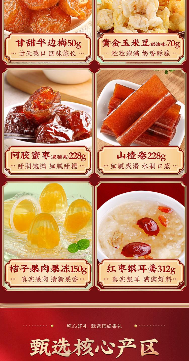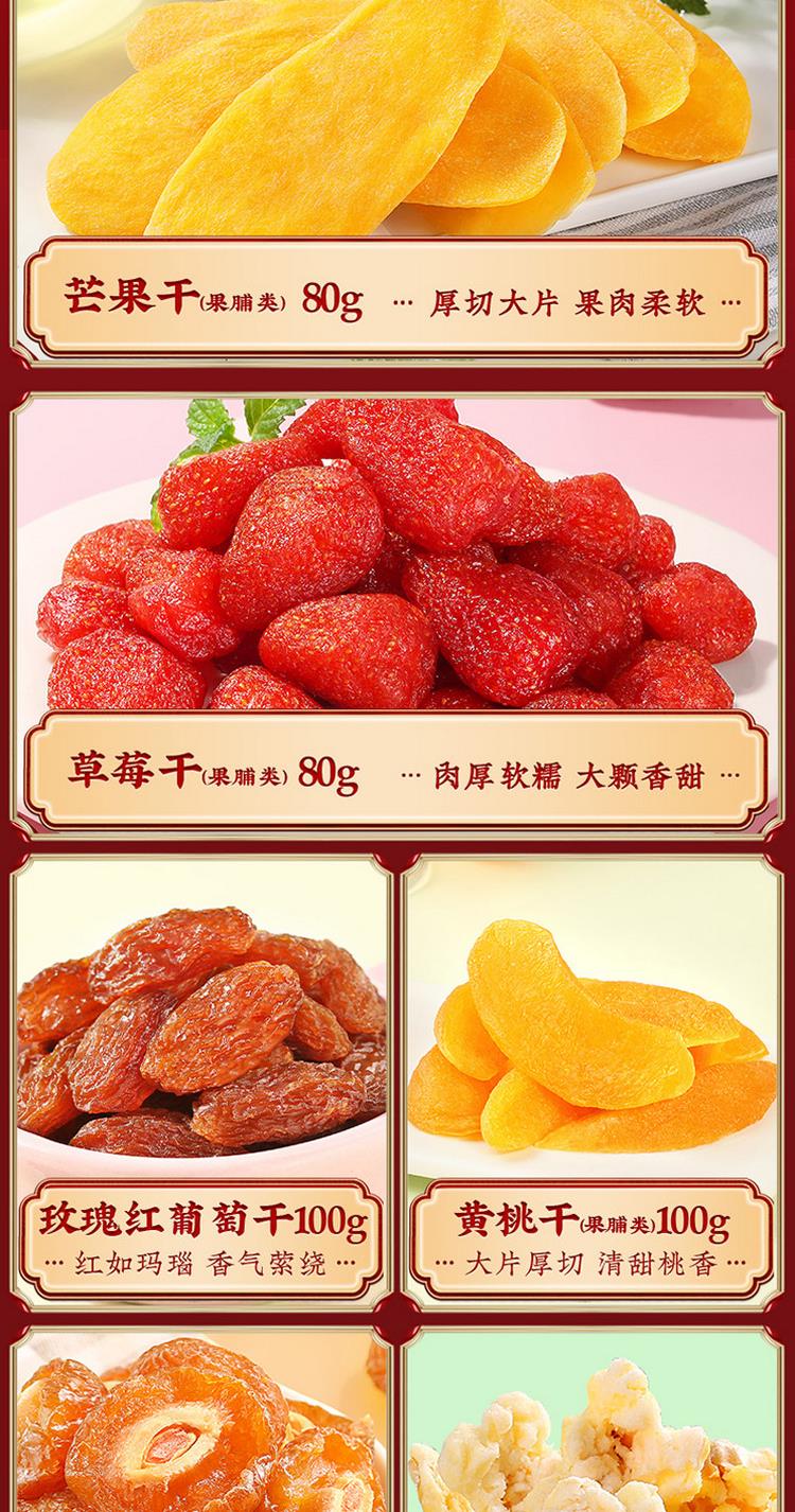 【百草味】芒果干80g/【百草味】草莓干80g/【百草味】黄桃干 100g/【百草味】黄金玉米豆 70g(奶油味)/【百草味】玫瑰红葡萄干100g/【百草味】山楂卷 228g/【百草味】甘甜半边梅50g/【百草味】阿胶蜜枣 228g/【百草味】桔子果肉果冻 150g/【百草味】红枣银耳羹 312g