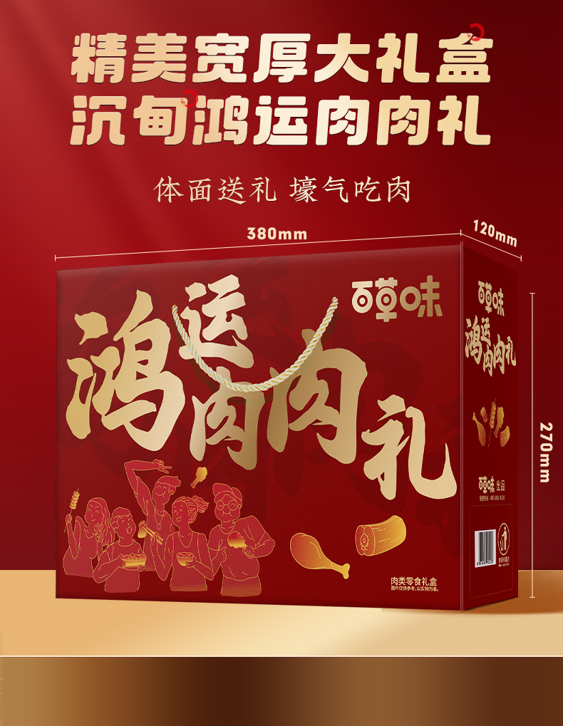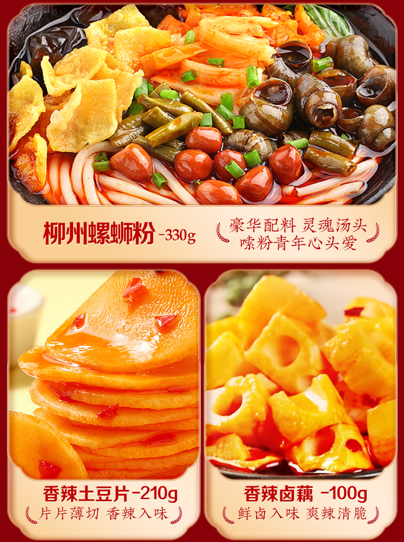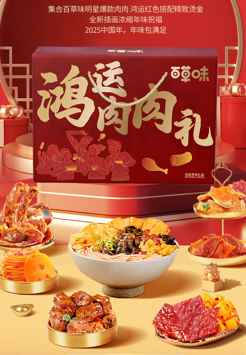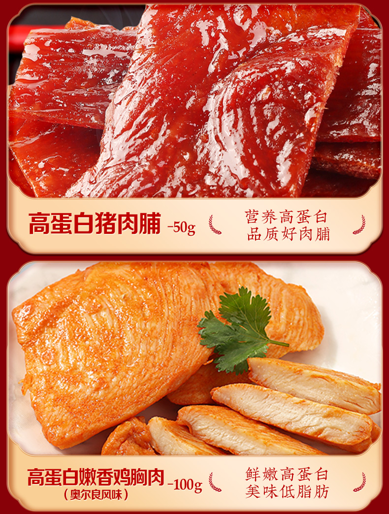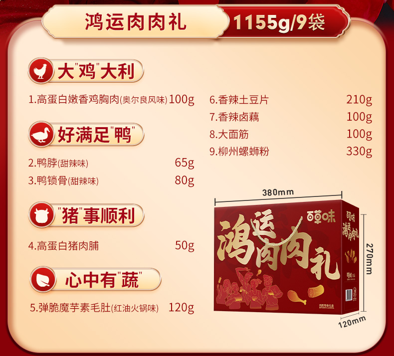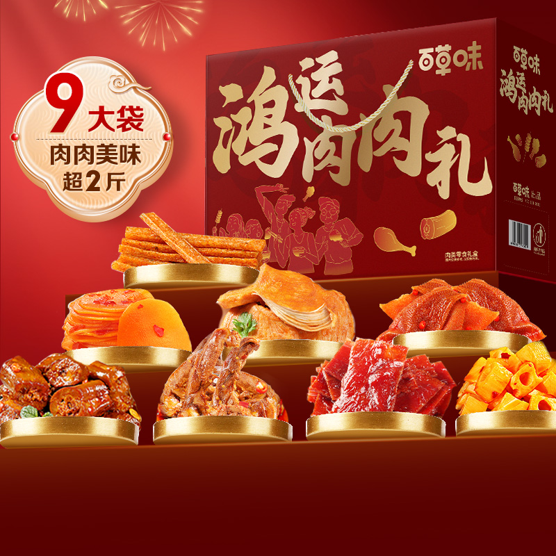 【百草味】高蛋白猪肉脯50g/【百草味】鸭锁骨(甜辣味)80g/【百草味】高蛋白嫩香鸡胸肉 100g(奥尔良风味)/【百草味】鸭脖(甜辣味)65g/【百草味】柳州螺蛳粉 330g/【百草味】大面筋100g/【百草味】香辣卤藕 100g/【百草味】香辣土豆片 210g/【百草味】弹脆魔芋素毛肚(红油火锅味) 120g