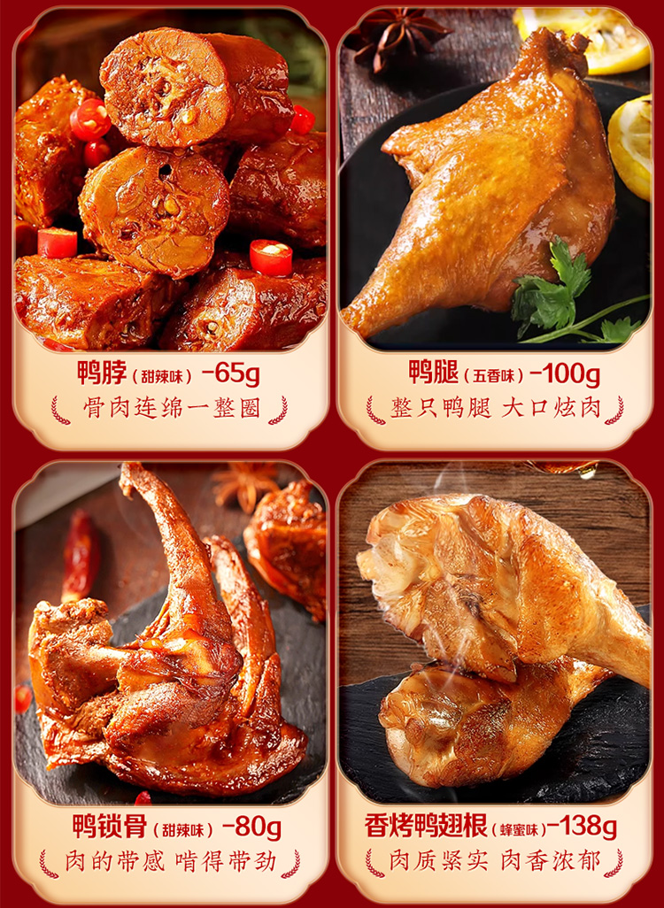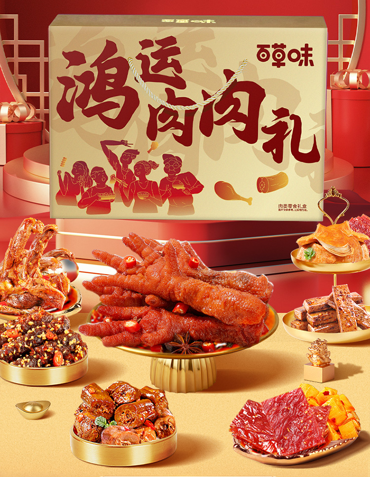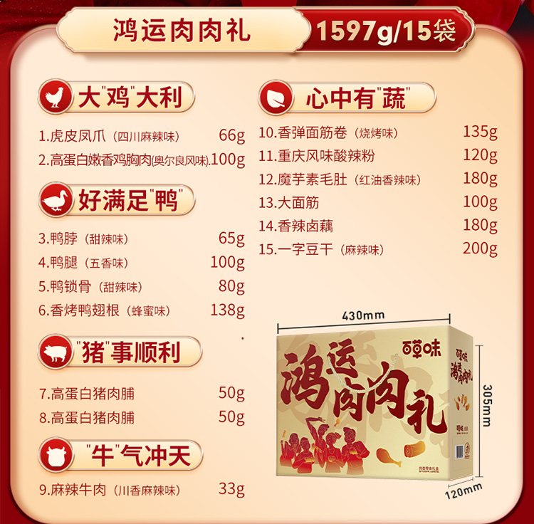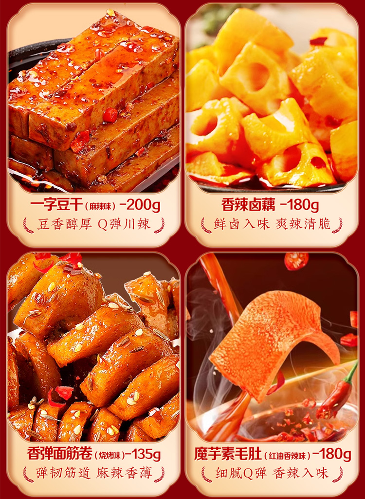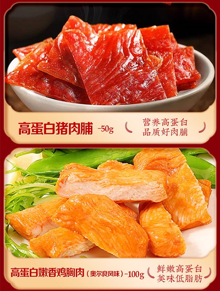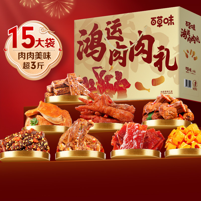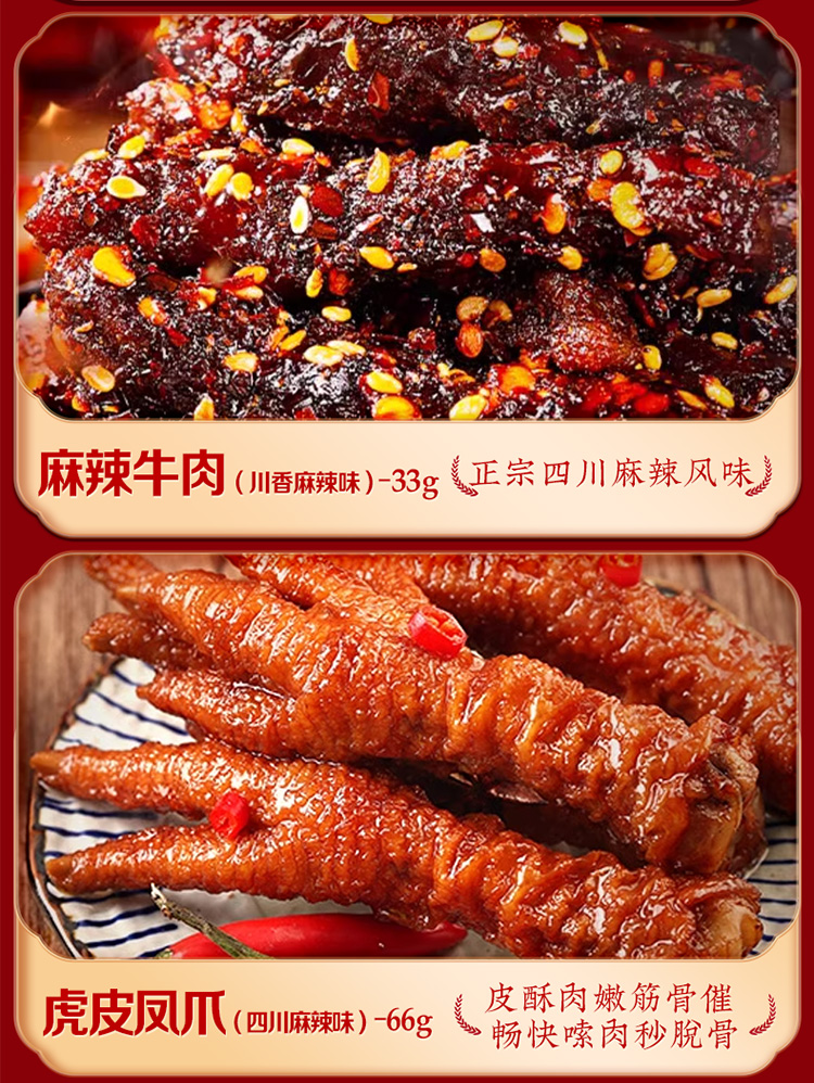 【百草味】高蛋白猪肉脯50g/【百草味】虎皮凤爪(荆楚甜辣味)-66g/【百草味】麻辣牛肉(川香麻辣味)33g/【百草味】鸭锁骨(甜辣味)80g/【百草味】高蛋白嫩香鸡胸肉 100g(奥尔良风味)/【百草味】鸭脖(甜辣味)65g/【百草味】香烤鸭翅根 138g(蜂蜜味)/【百草味】鸭腿 100g(五香味)/【百草味】香弹面筋卷 135g(烧烤味袋装)/【百草味】重庆风味酸辣粉 120g/【百草味】魔芋素毛肚 180g(红油香辣味)/【百草味】大面筋100g/【百草味】香辣卤藕 180g/一字豆干(麻辣味)