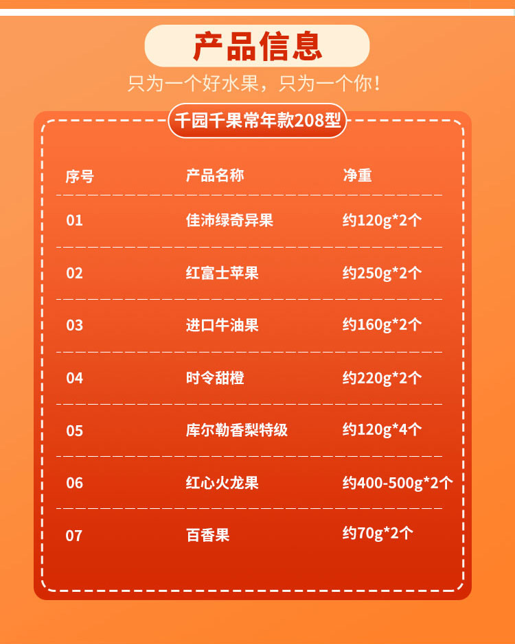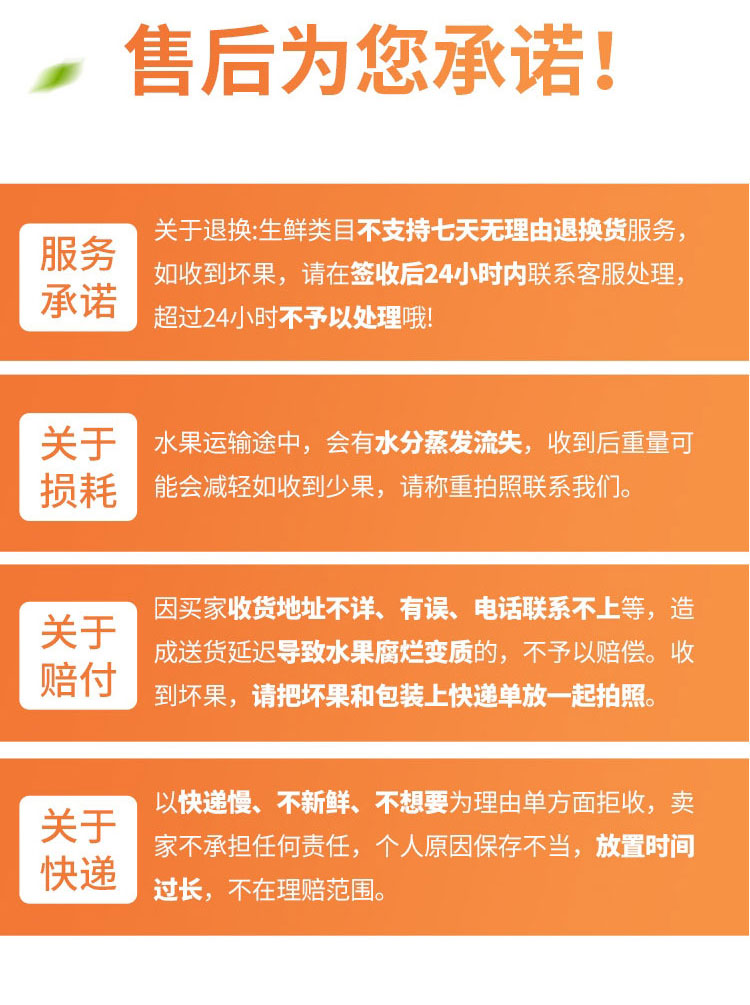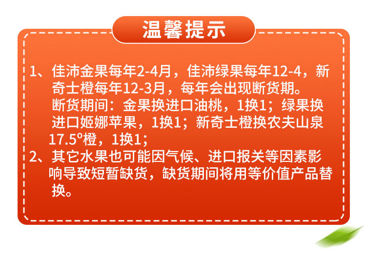 佳沛金果每年2-4月,佳沛绿果每年12-4,新奇士橙每年12-3月,会出现断货期。断货期间佳沛绿果替换为:进口姬娜苹果约160g/个;佳沛金果换:智利进口油桃约180-200g/个,新奇士橙换农夫山泉17.5º橙220-250g/个 发货