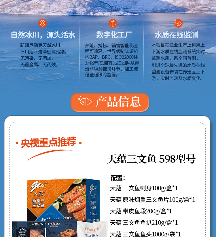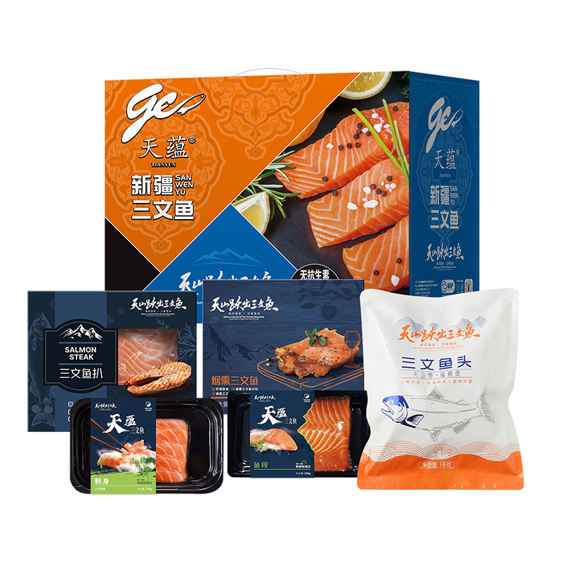 天蕴 三文鱼刺身100g/盒*1 天蕴 原味烟熏三文鱼片100g/盒*1 天蕴 带皮鱼段200g/盒*1 天蕴 三文鱼鱼扒210g/盒*1 天蕴 三文鱼鱼头1000g/袋*1