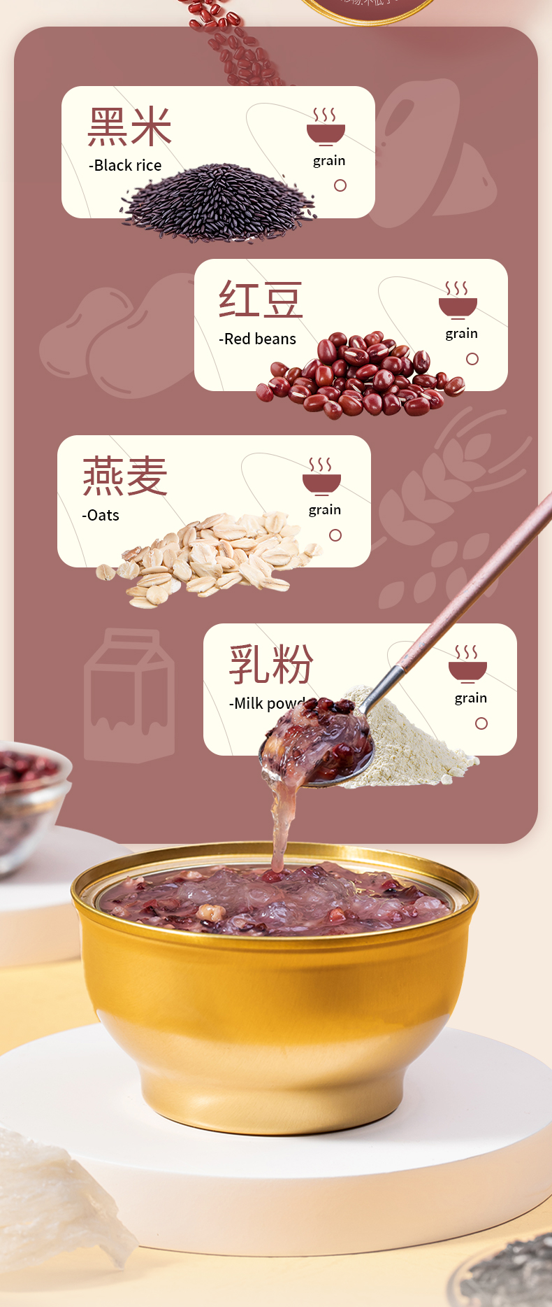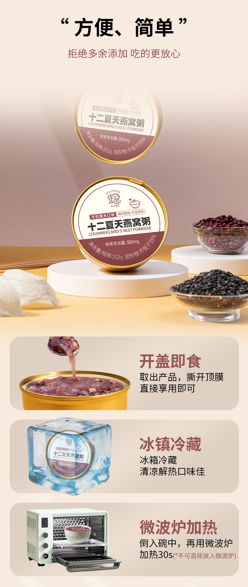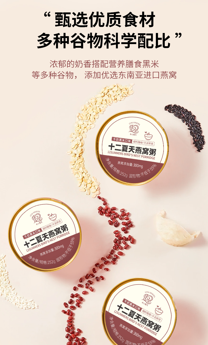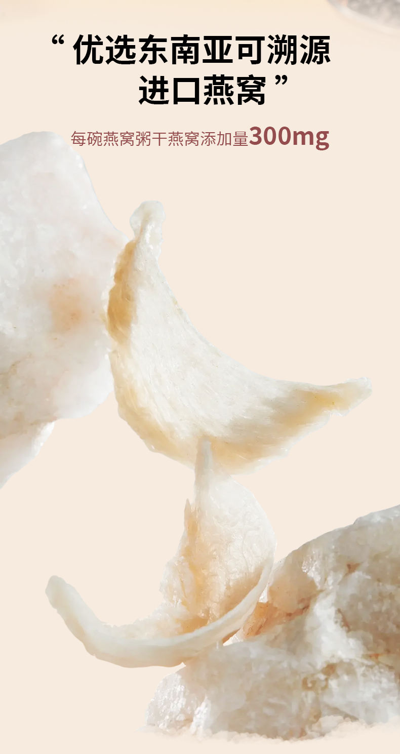 1.高膳食纤维搭配牛奶,营养燕窝,口感有层次 2.低脂肪,低热量,高营养。配料纯0添加,0色素,0防腐剂 3.保留食材本味与营养,独立包装方便便携。