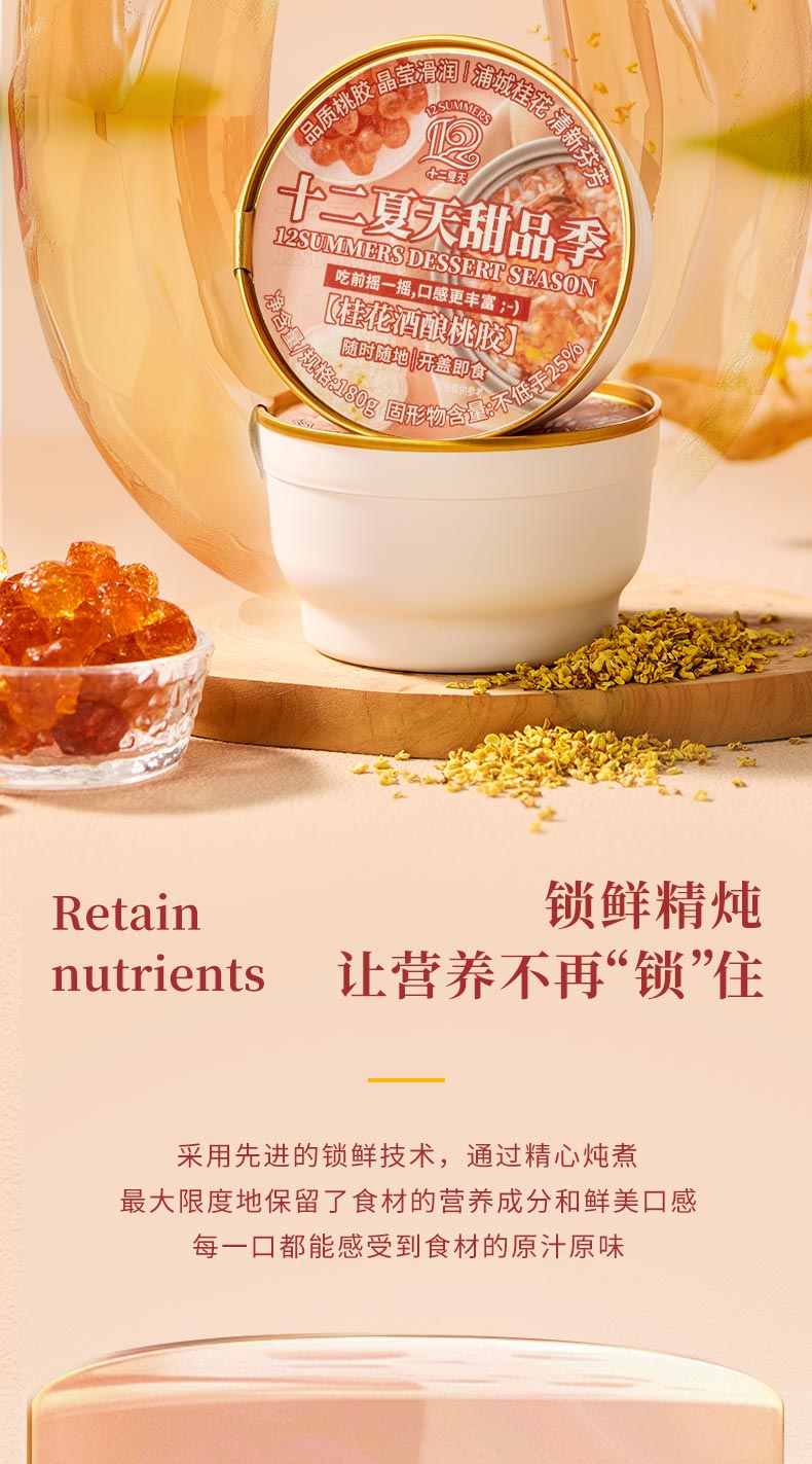 十二夏天甜品季【桂花酒酿桃胶】—— 以东方美学焕新传统甜品,当山野桃胶邂逅古法酒酿的清香甜美,加上蒲城桂花、福建古田银耳和湖北魔芋米等优质食材锁鲜炖煮,东方颐养食材与轻奢甜品灵感碰撞——打破传统糖水边界,让滋养化作舌尖的风雅享受。