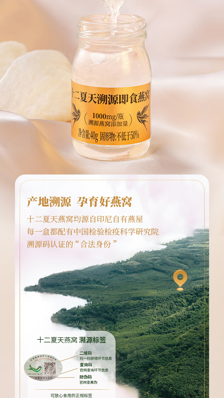 十二夏天溯源即食燕窝,每一口都是天然与匠心的结晶。甄选燕窝,品质至上,十二夏天燕窝均源自印尼自有燕屋,每一盒都配有中国检验检疫科学研究院溯源码认证的“合法身份”,不仅原料进口安全,配料表也干净纯粹,只有水和燕窝,加以冰糖调味,0添加0防腐剂、0香精0色素,每一口都是纯甄品质,吃得放心,送礼更安心。