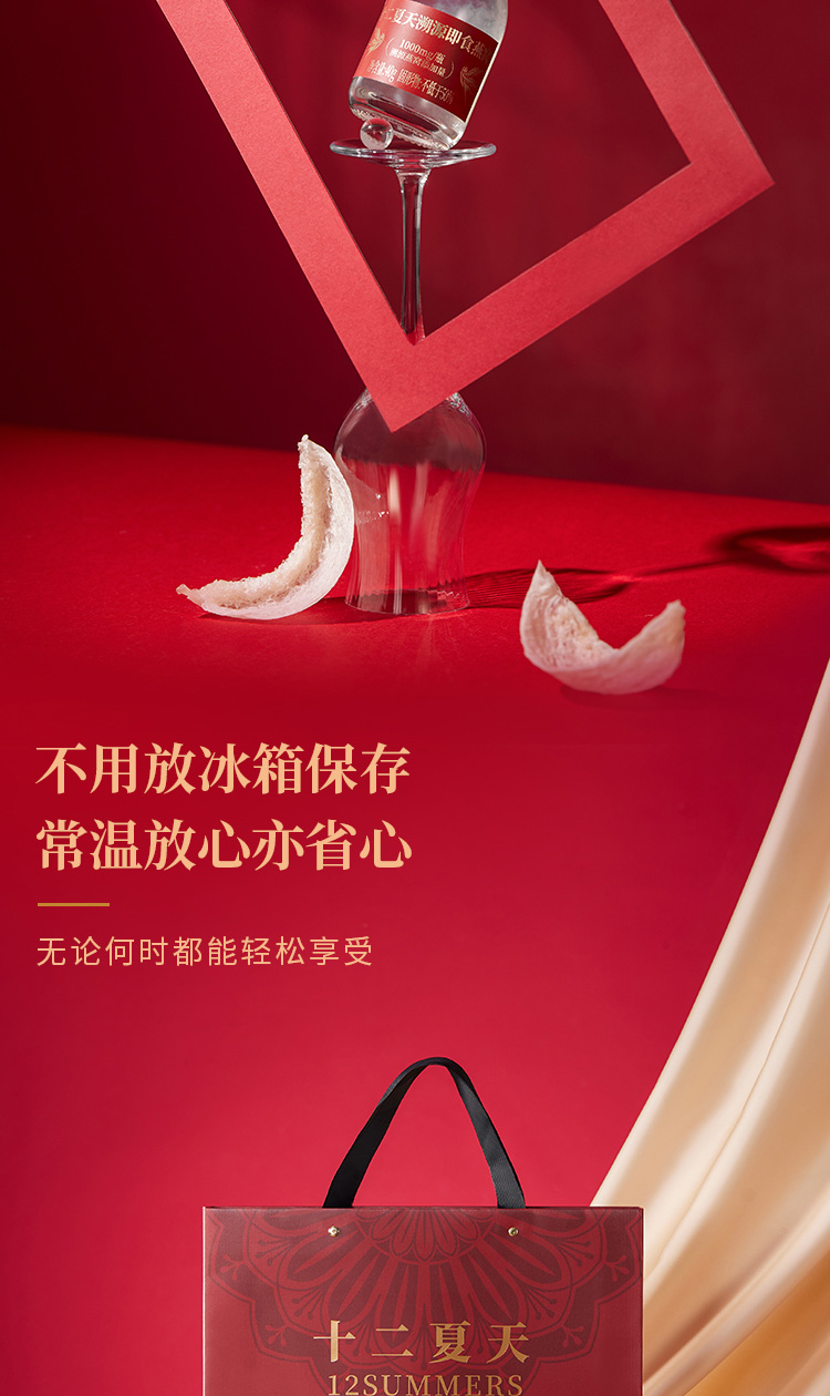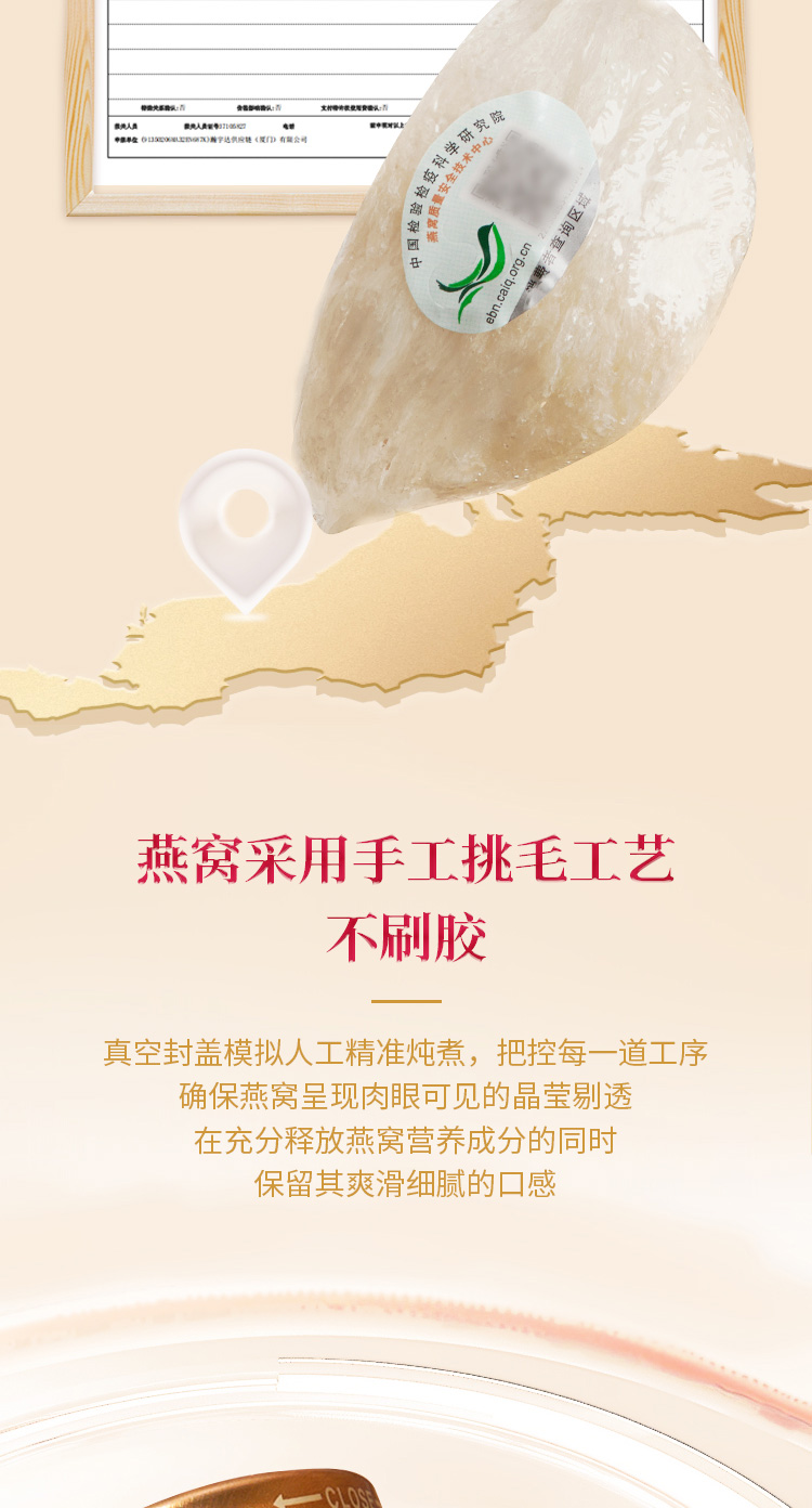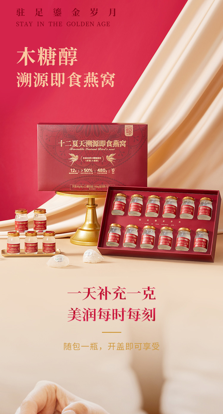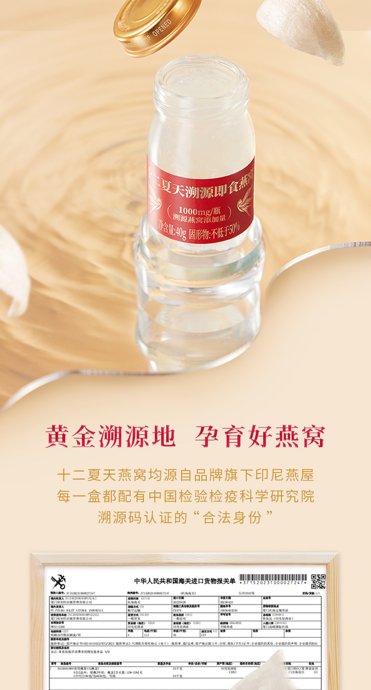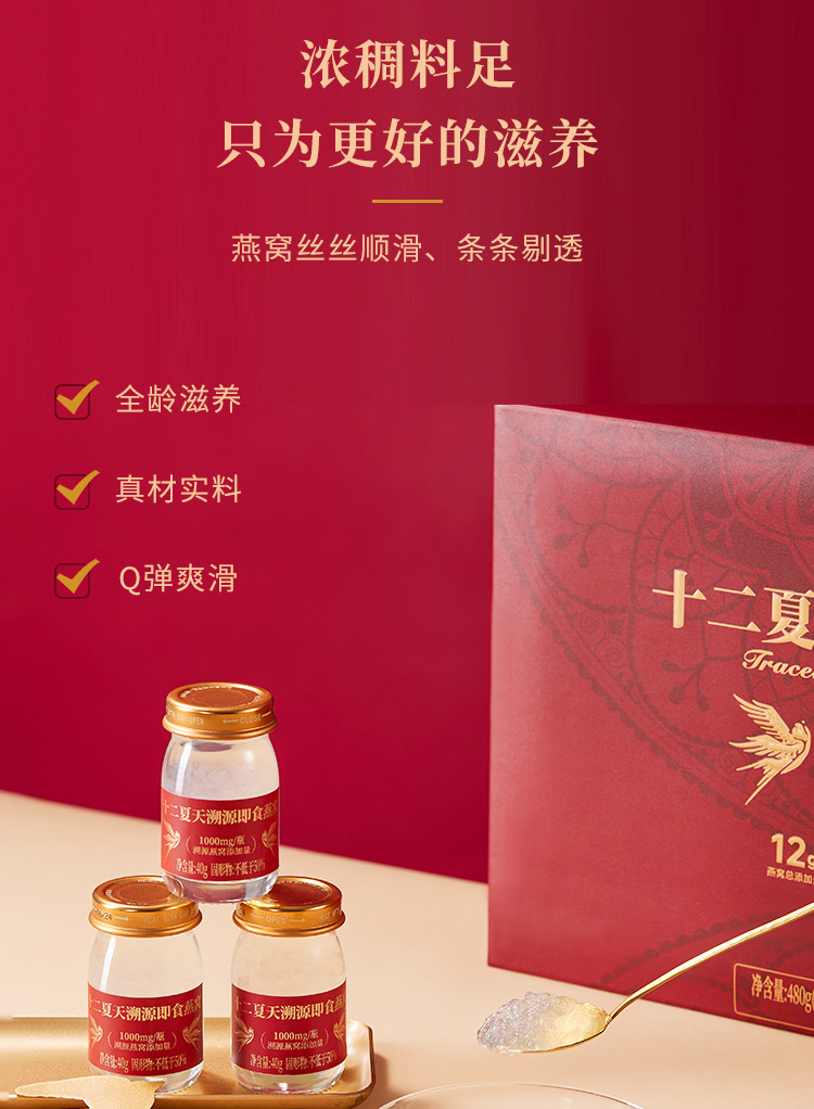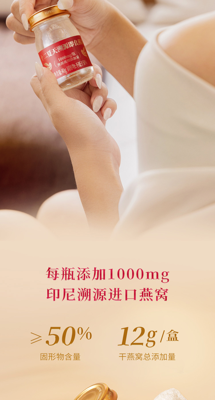 每一瓶即食燕窝均配有中国检验检疫科学研究院认证的CAIQ溯源码,这不仅是对其“合法身份”的证明,更是对原料进口安全和纯粹性的坚定承诺。礼盒设计典雅精致,红色基调配以暗纹与烫金工艺,彰显品牌的低调奢华与优雅。无论是自用还是馈赠亲友,都能传递出满满的尊贵与心意。内嵌独立瓶装燕窝,一盒12瓶,每瓶蕴含1000mg印尼溯源进口燕窝,固形物含量高达50%以上,真材实料,每一口都能感受到燕窝的细腻与浓郁。