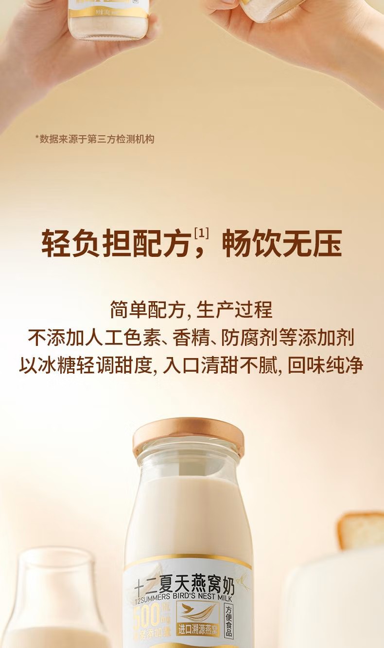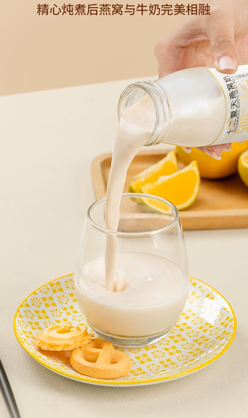 选用印尼进口的燕窝和优选牧场奶源,传递源头的新鲜滋味。每瓶投料500mg干燕窝,燕丝晶莹分明,细润爽滑,生产过程中不添加任何化学添加剂和人工色素,仅以冰糖调味,每一滴都凝聚着大自然的精华,为你带来最纯粹、天然的滋养体验。