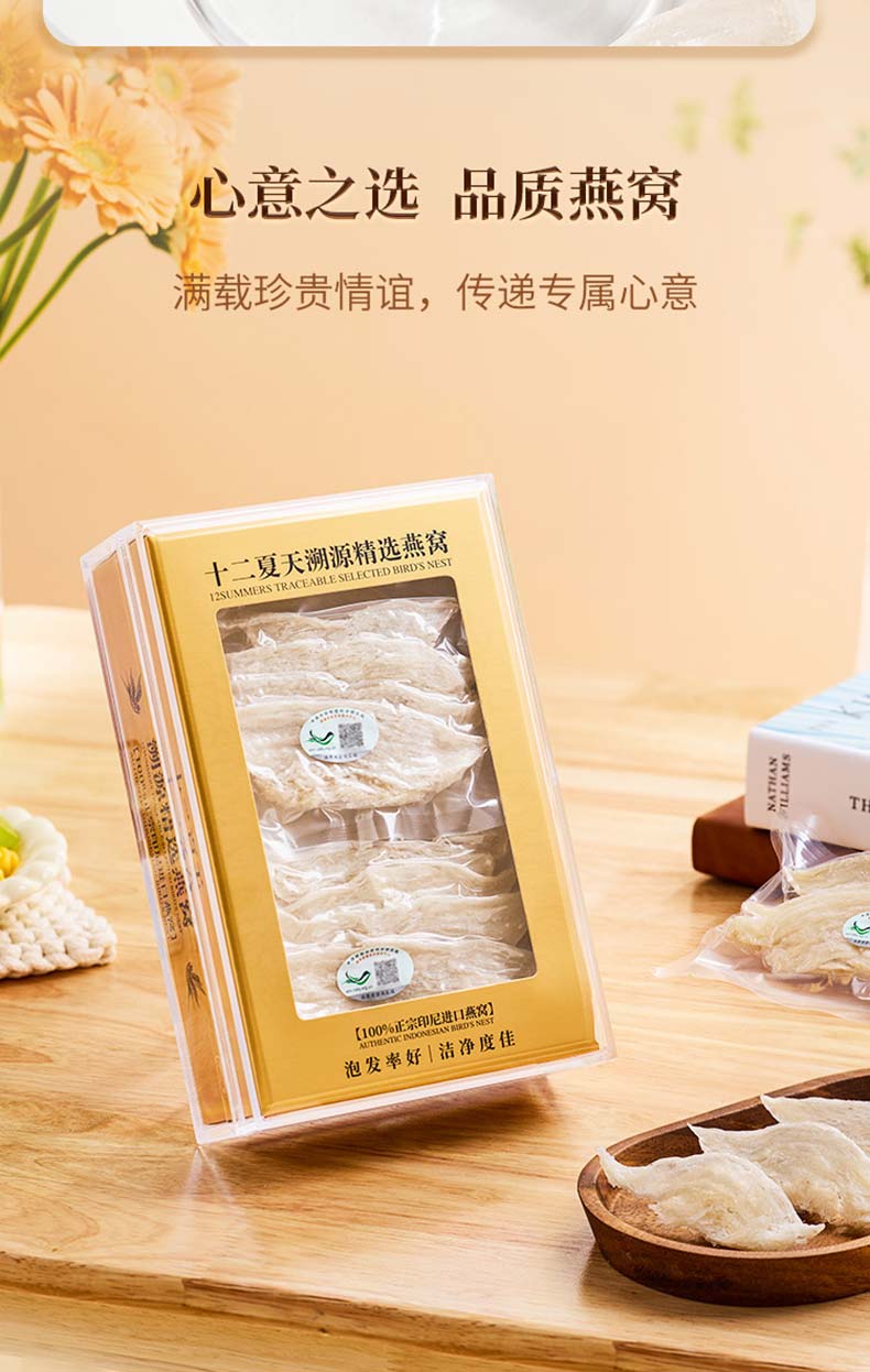 每片燕盏都源自印尼与马来西亚的自然馈赠,我们承诺,每一盏燕窝均为原产地直采,严格遵循自然法则,拒绝任何化学干预——0刷胶、0漂白、0添加,纯粹如初,100%纯天然品质保证。中国检验检疫科学研究院溯源码认证,一盏一码,每一盏都有独一无二的合法身份证,溯源保障、安心滋补。泡发出后的燕窝晶莹剔透、燕丝分明。