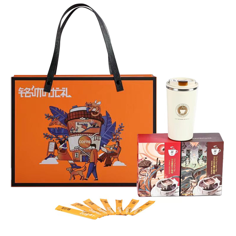 1、耶加雪菲/黄金曼特宁/哥伦比亚挂耳*2盒(3款随机搭配两盒或两盒同款) 2.手提式精瓷内胆咖啡杯*1 3.赤沙糖7条*5g 4.专属手提礼盒 5、丝巾*1条