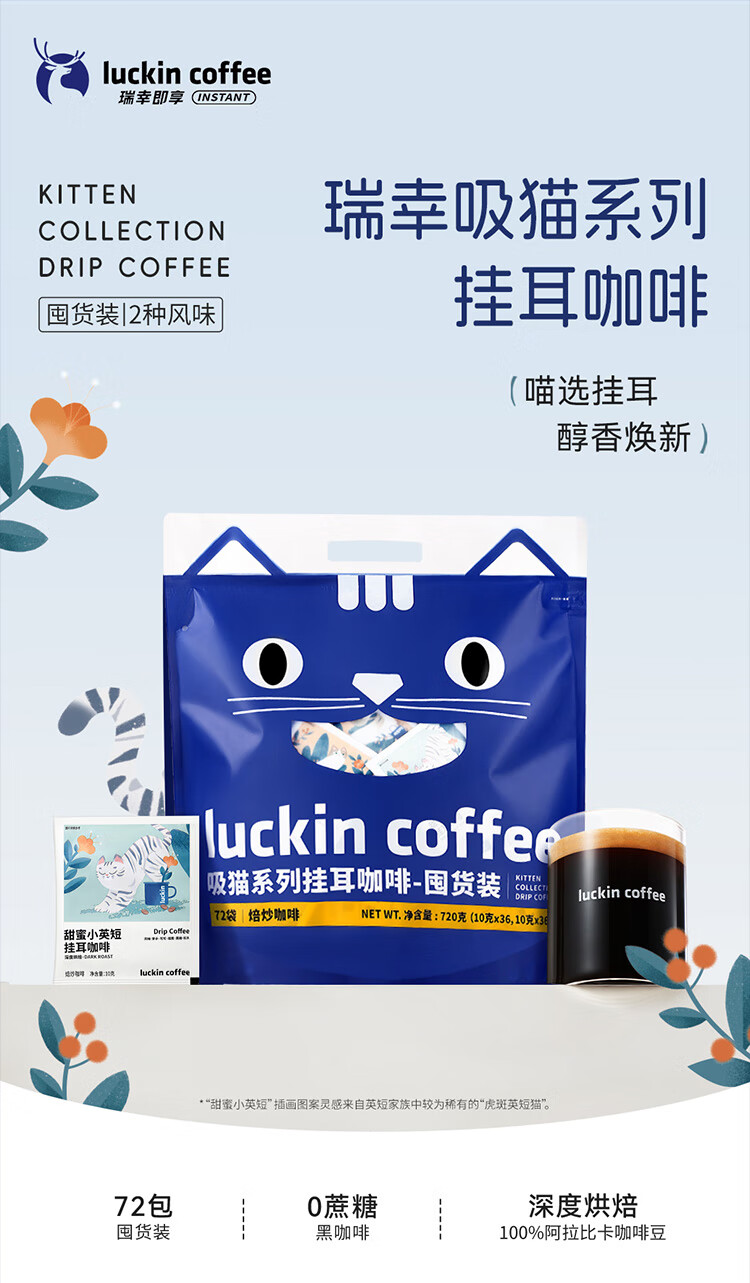瑞幸咖啡 吸猫2.0挂耳咖啡风味囤货混合装72袋RX0041