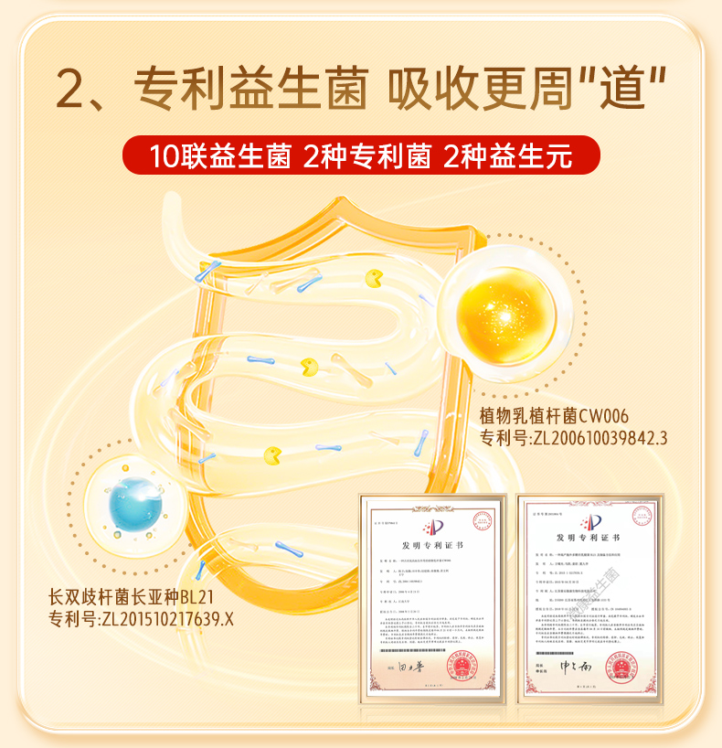 3、10种益生菌,双专利菌,双益生元,改善肠道菌群