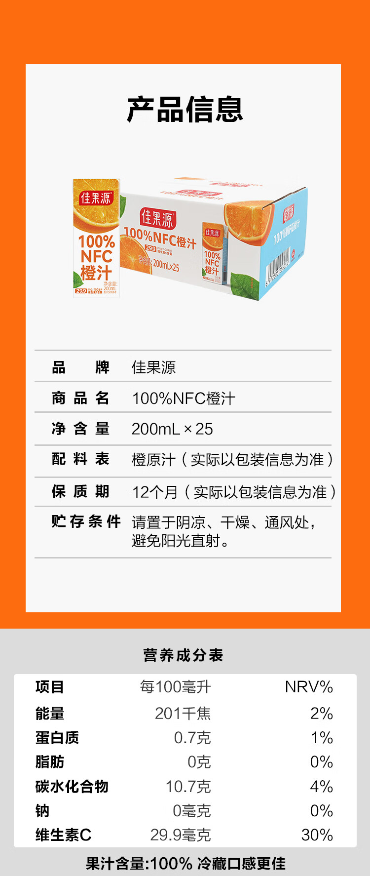 佳果源 100%NFC橙汁200ml*25
