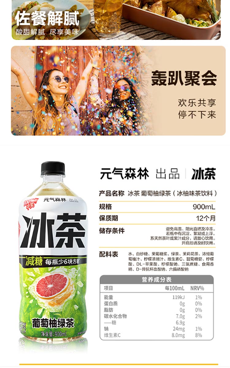 元气森林 冰茶-低糖-葡萄柚冰绿茶 PET900ml
