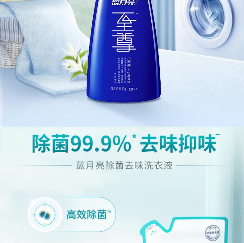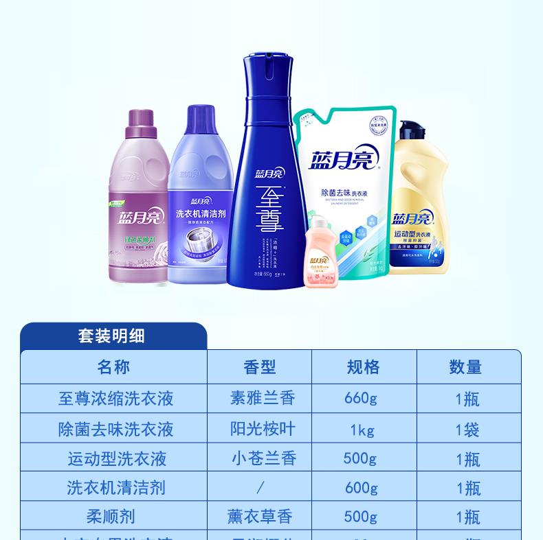 蓝月亮至尊生物实色蓝660g+500g柔顺剂瓶-薰+600g洗衣机清洁剂+除菌洗袋1kg+运动洗翻盖500g+80g内衣洗 81000804