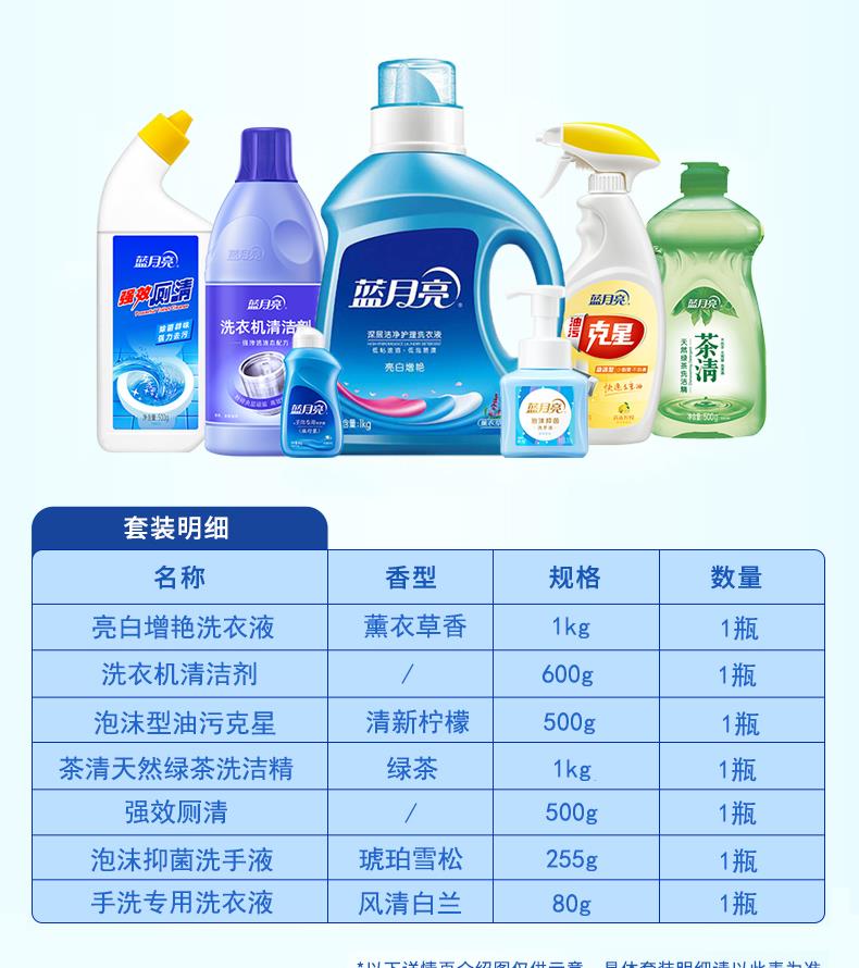 蓝月亮1kg亮白薰+500g茶清+泡沫抑菌洗手液(琥珀雪松)255ml+600g洗衣机清洁+500g强效厕清+500g油污瓶-柠檬泡沫+80g旅行白兰 81000805