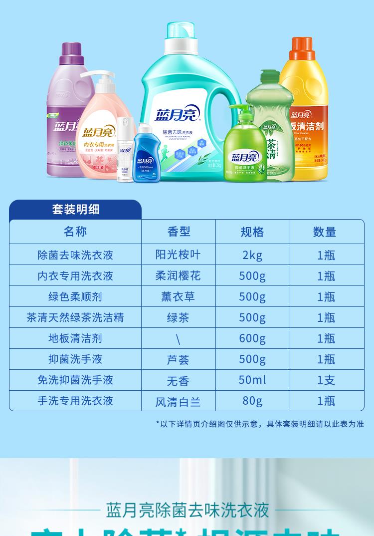 蓝月亮洗护家清组合1(2kg去味除菌-阳光桉叶+500g樱花内衣洗+500g薰柔顺剂瓶+500g茶清+600g地板水+50ml免洗+80g手洗)81000738